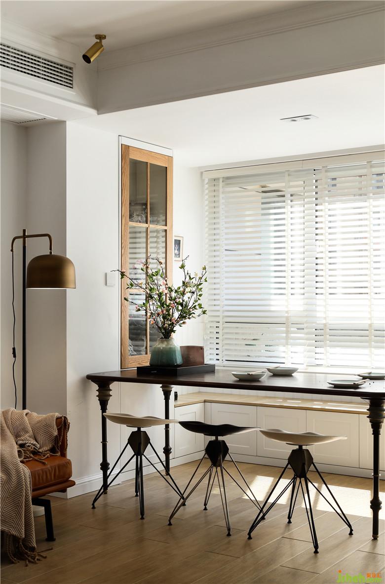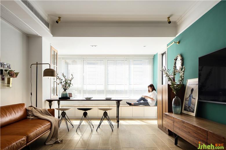 ▲室内设计师将原本客厅阳台的区域打通改造成用餐区,利用阳台外墙抽槽铺设靠背板,增添带了收纳功能的卡座。使客餐厅部分的视觉效果更加统一,房屋的功能分区更加合理。一面绿墙点缀,其他墙面皆为白色,点缀上蜜糖色的沙发,木色柜组,给空间染上了淡淡的复古感。