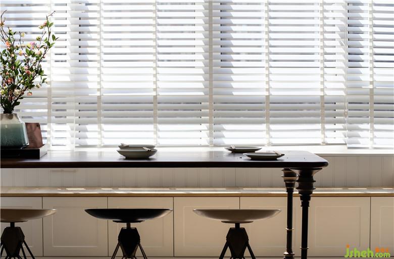 ▲原本餐厅的位置过于狭小,无法一家五口的用餐需要。室内设计师将此处设计成吧台式西餐岛台的形式,橱柜采用浅原木色,符合西式简餐的氛围。