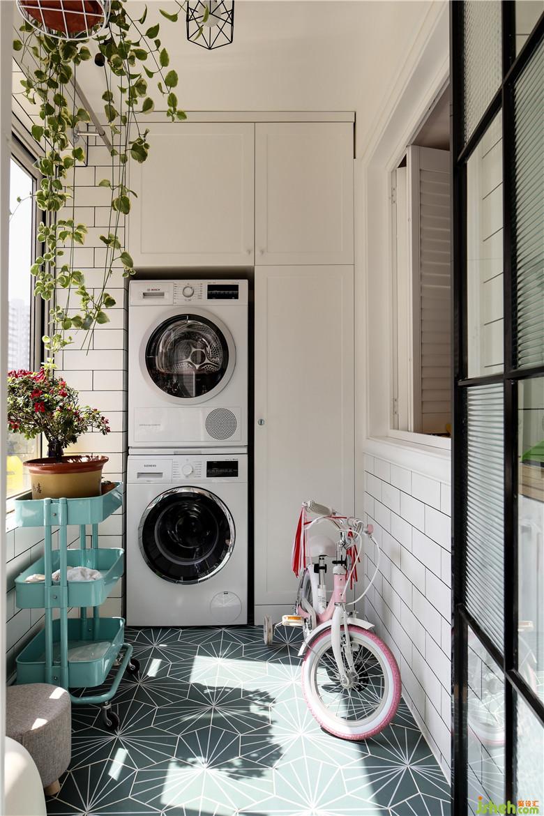 ▲阳台部分与餐厅部分有由玻璃推门连接,与儿童房的窗户做了百叶折叠窗为遮挡。白色墙砖搭配花纹地砖干净、清新。洗衣机烘干机嵌入式放置节省空间,收纳柜满足日常生活收纳。