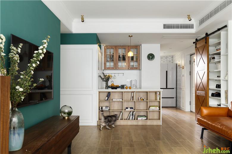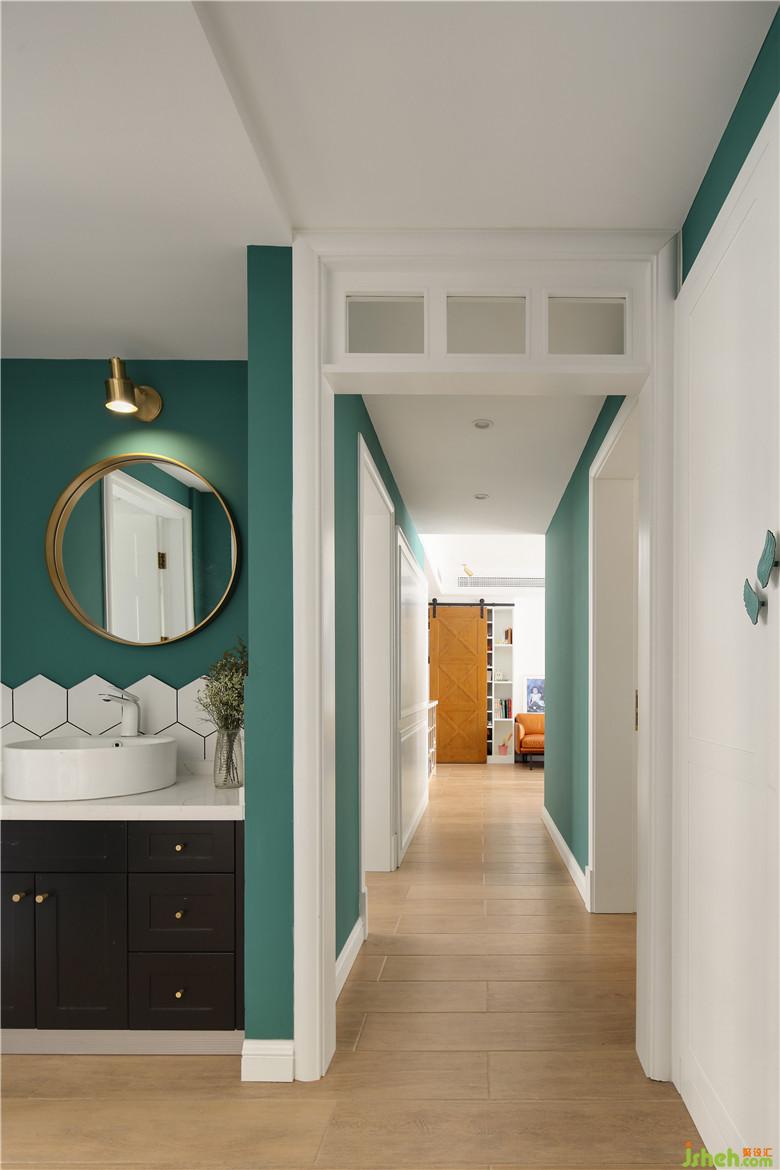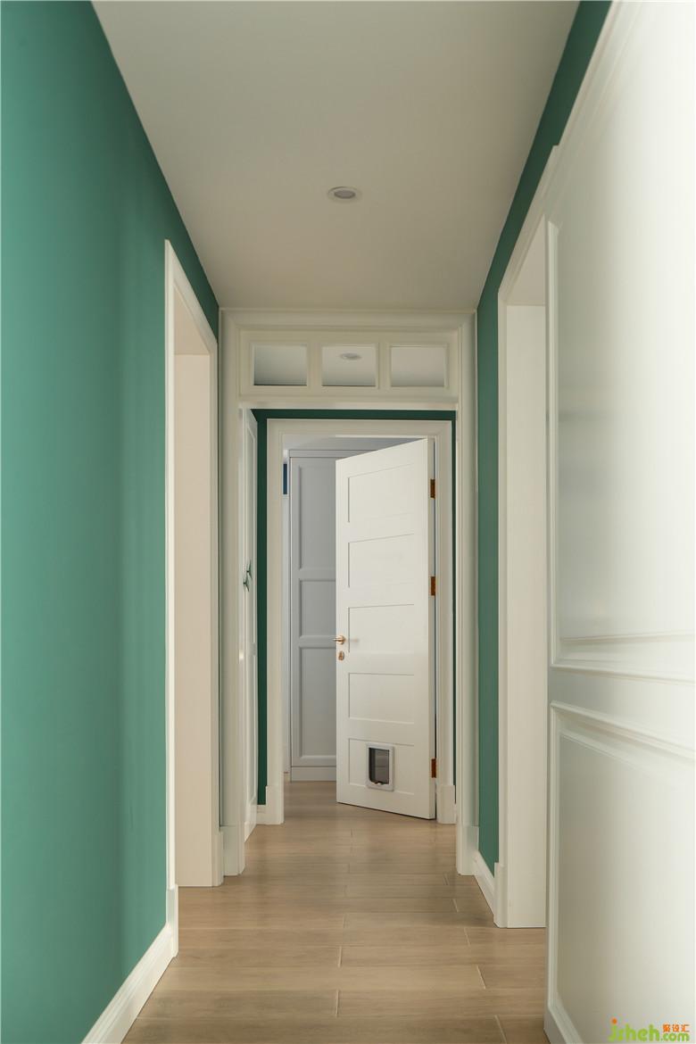 ▲走道空间绿白亮色的搭配,给人以利落、清爽的视觉感受。门体、门套以及踢脚线皆为白色。设计师为了改善通道过长的问题,在走道中部位置增加了一道门做分割作用,门楣部分采用木格样式,起装饰作用的也增加通透感,虚实结合又不失美貌。注意到了吗?一道半开的门体上屋主还为家里的猫主子也留了一道门,铲屎官们都要有这个觉悟才好~