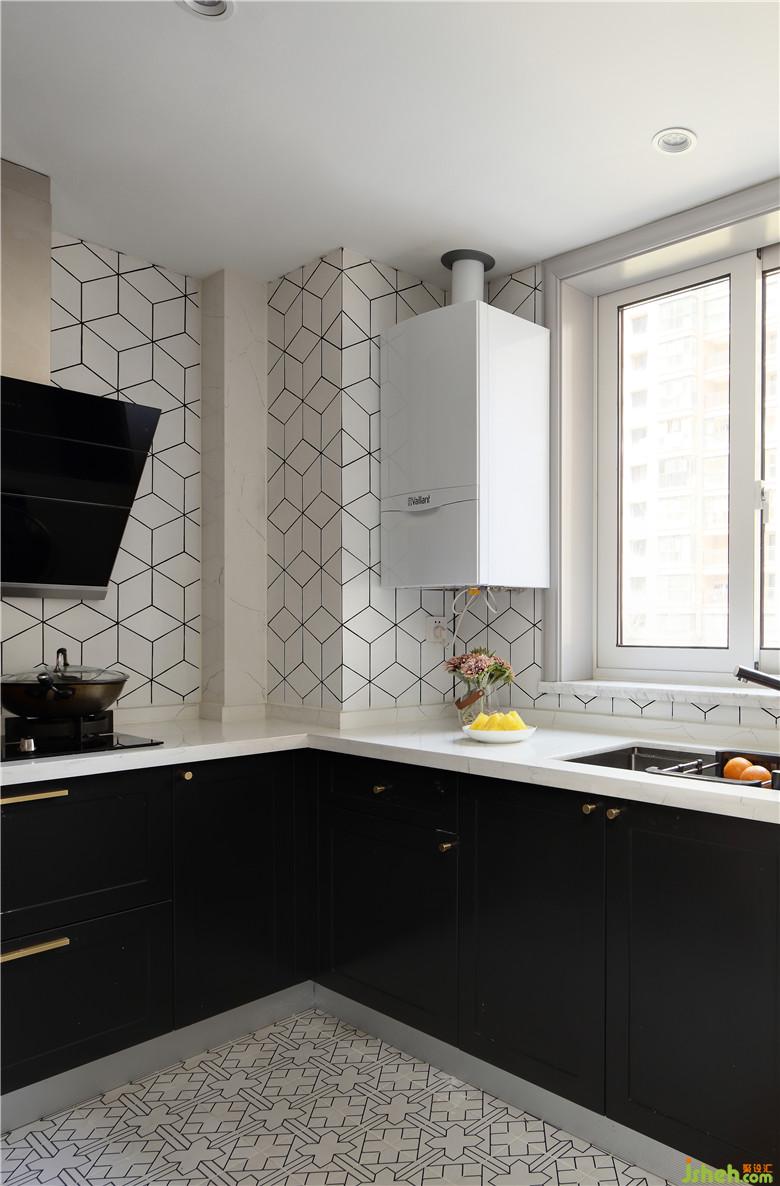 ▲中厨部分与西厨部分背靠,组成完整的厨房功能。中厨空间色调以黑白为主,视觉感统一。墙面的几何线条砖和地面花砖打破了黑白配色的沉闷感,让中式厨房也可以有趣起来~
