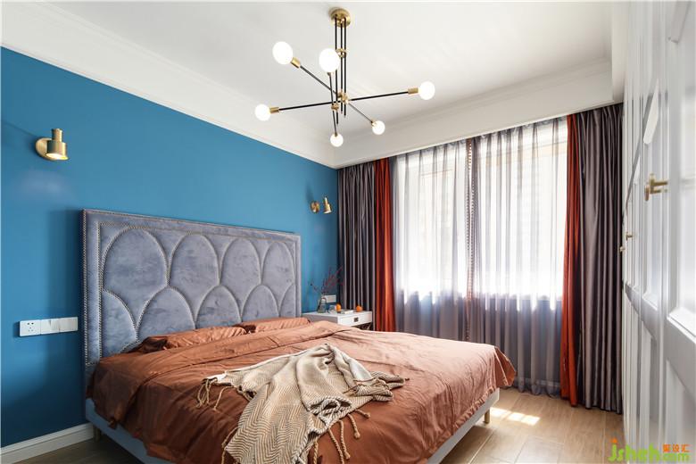 ▲主卧部分设计师墙体采用了蓝、白的配色,软装部分的灰与红冲淡了冷清,只留下一屋复古、沉静与柔情的气息。灯饰部分的黄铜色与不规则形状也为空间增添了年轻感。