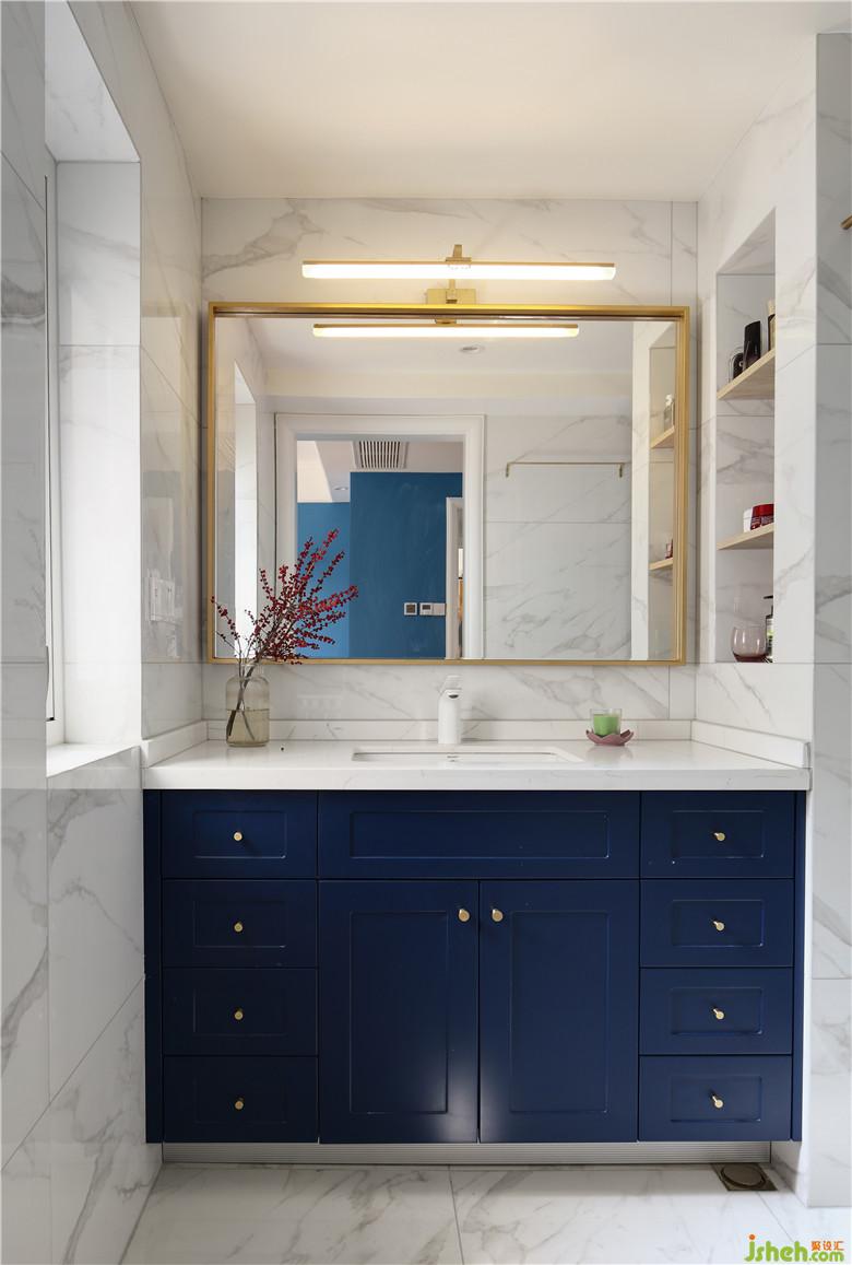 ▲卫生间部分采用干湿分离形式,主卫部分干区的柜体采用了跟床头背景墙相呼应的沉静的蓝色,白色大理石纹的贴砖增添清爽、洁净感,黄铜色包边的镜子和镜前灯也起到画龙点睛作用。