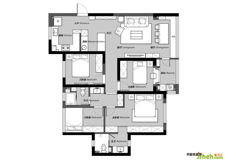 ▲次卫的卫生间干区设置在靠近老人房间的位置,方便使用。风格上与过道风格保持一直,形成完整的视觉观感。洗手台后白色六角形贴砖丰富视觉效果。
