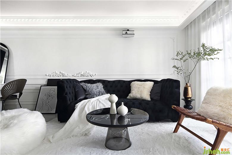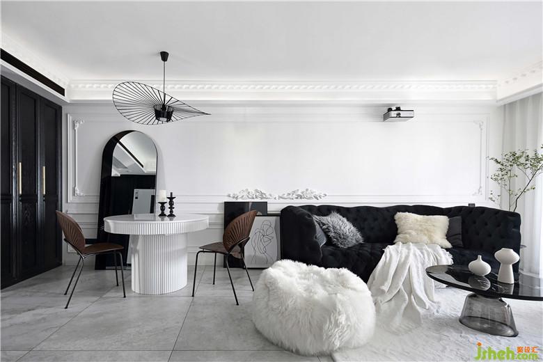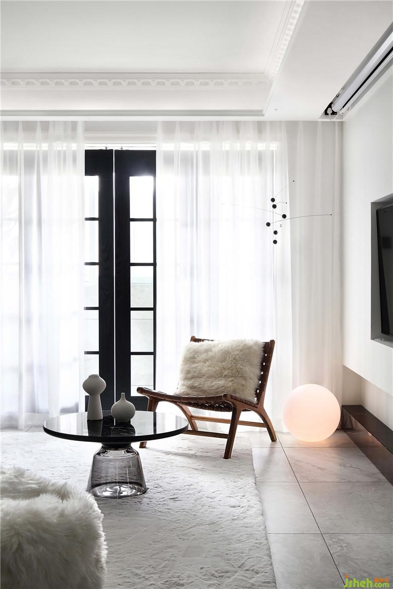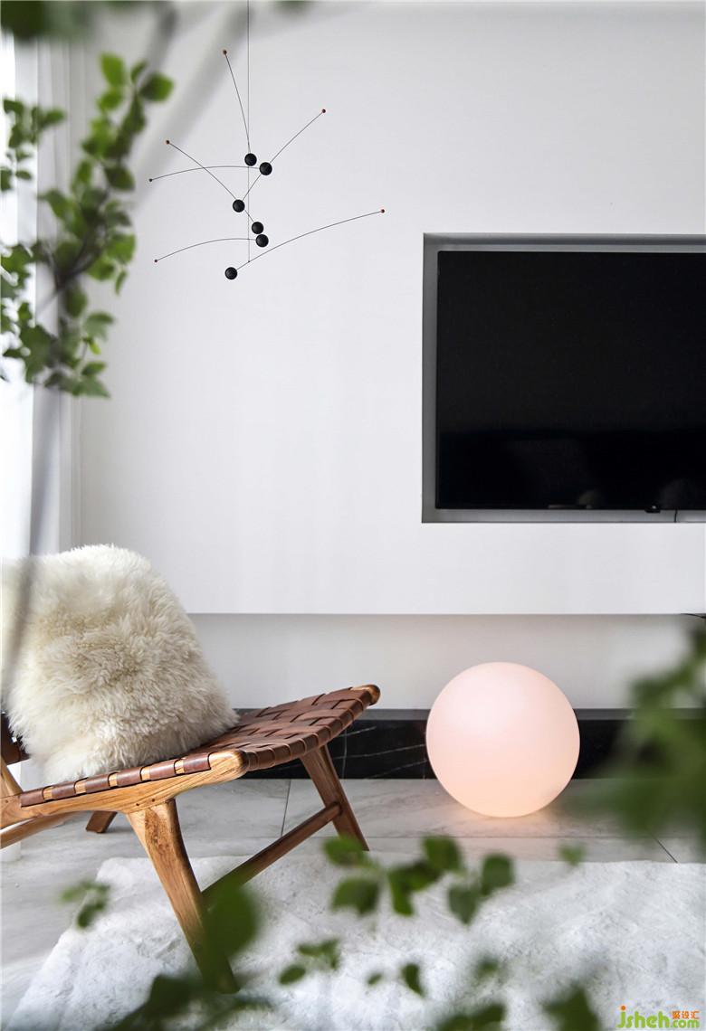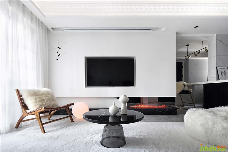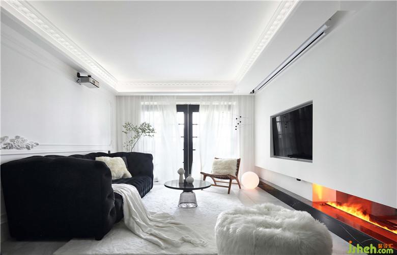 大块面的电视背景墙,白为主色,黑色地台落地。右侧全镂空放置雾化壁炉 ,橙红色的跳跃的火焰,让这里不仅适合静静地观看一部旧时的文艺电影,也可以围炉夜话,共度家人间的柔软时光。