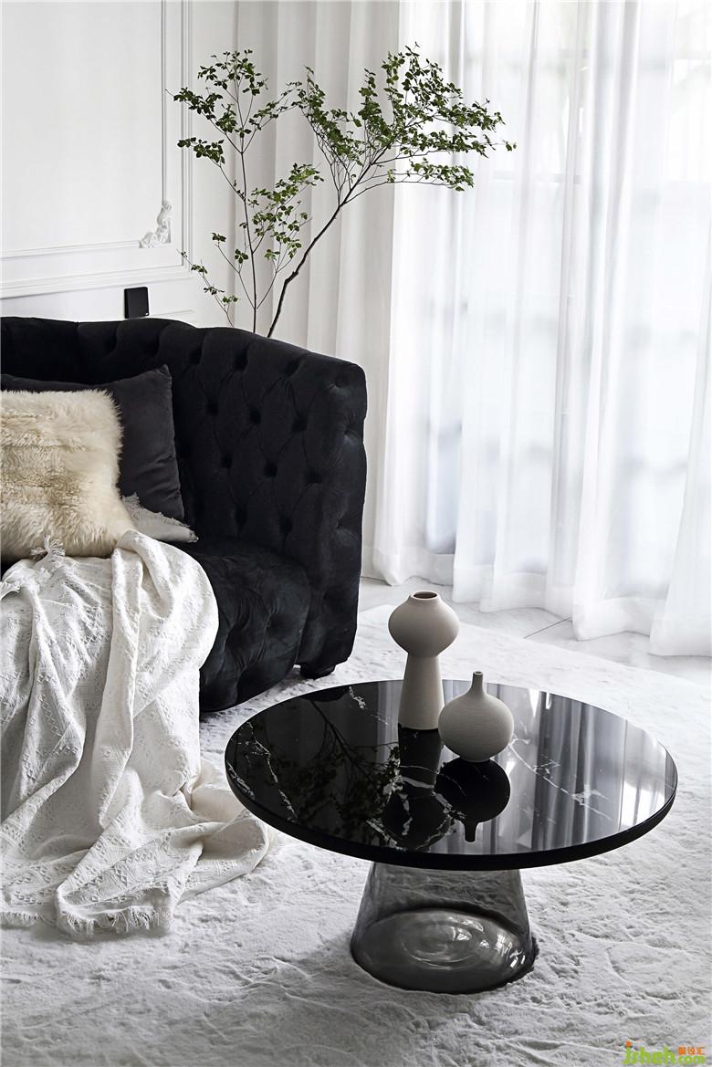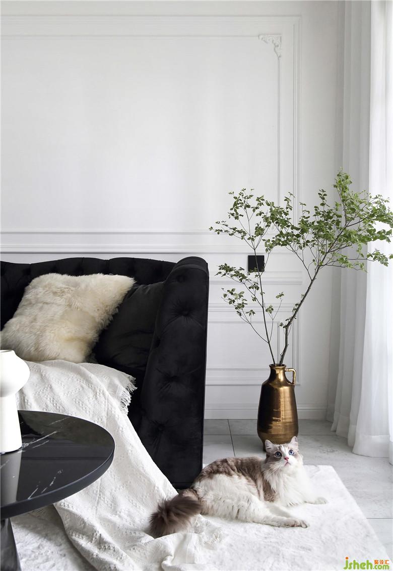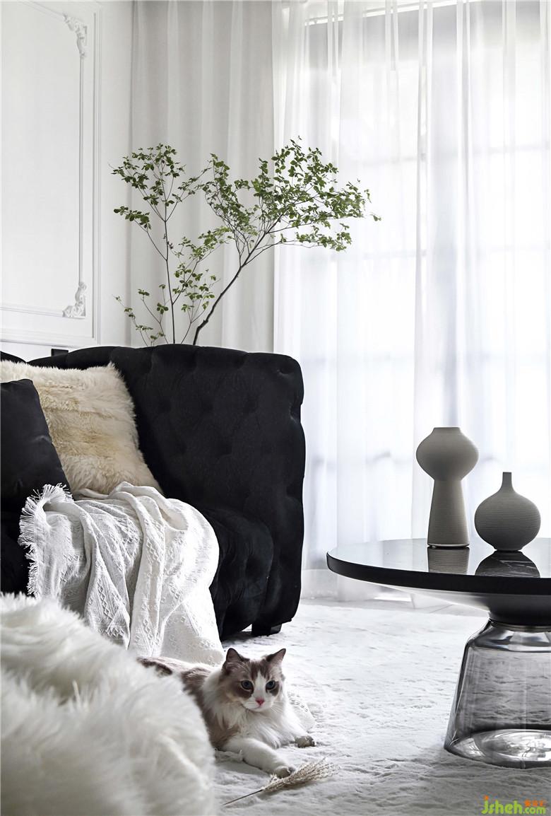 细枝绿叶总是宜人的,白墙上的石膏线条像是画框,无饰的雪纺窗帘让光线透进来,映出茶几的大理石纹就很有天然的质感。