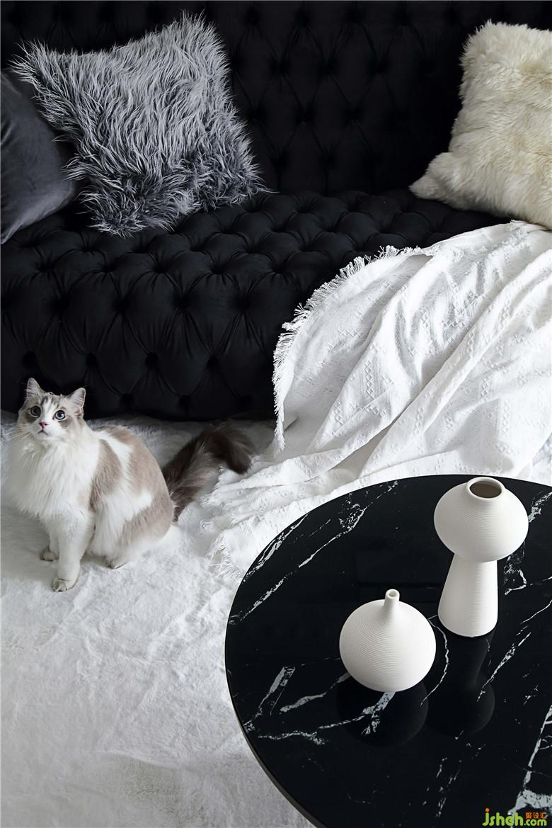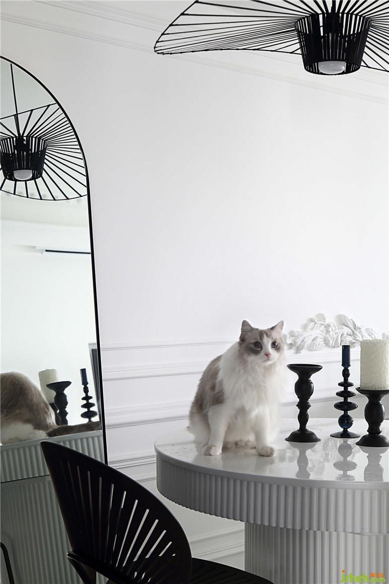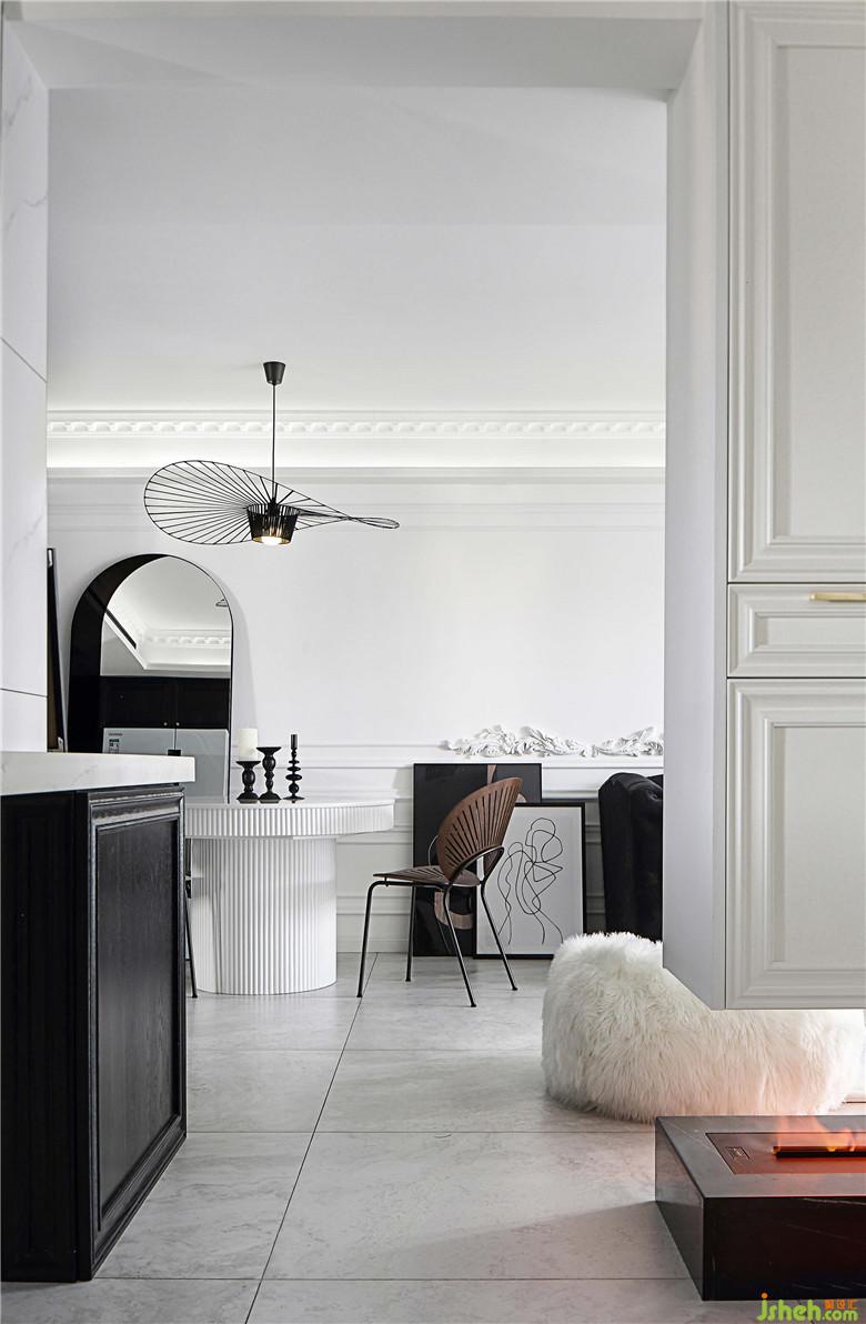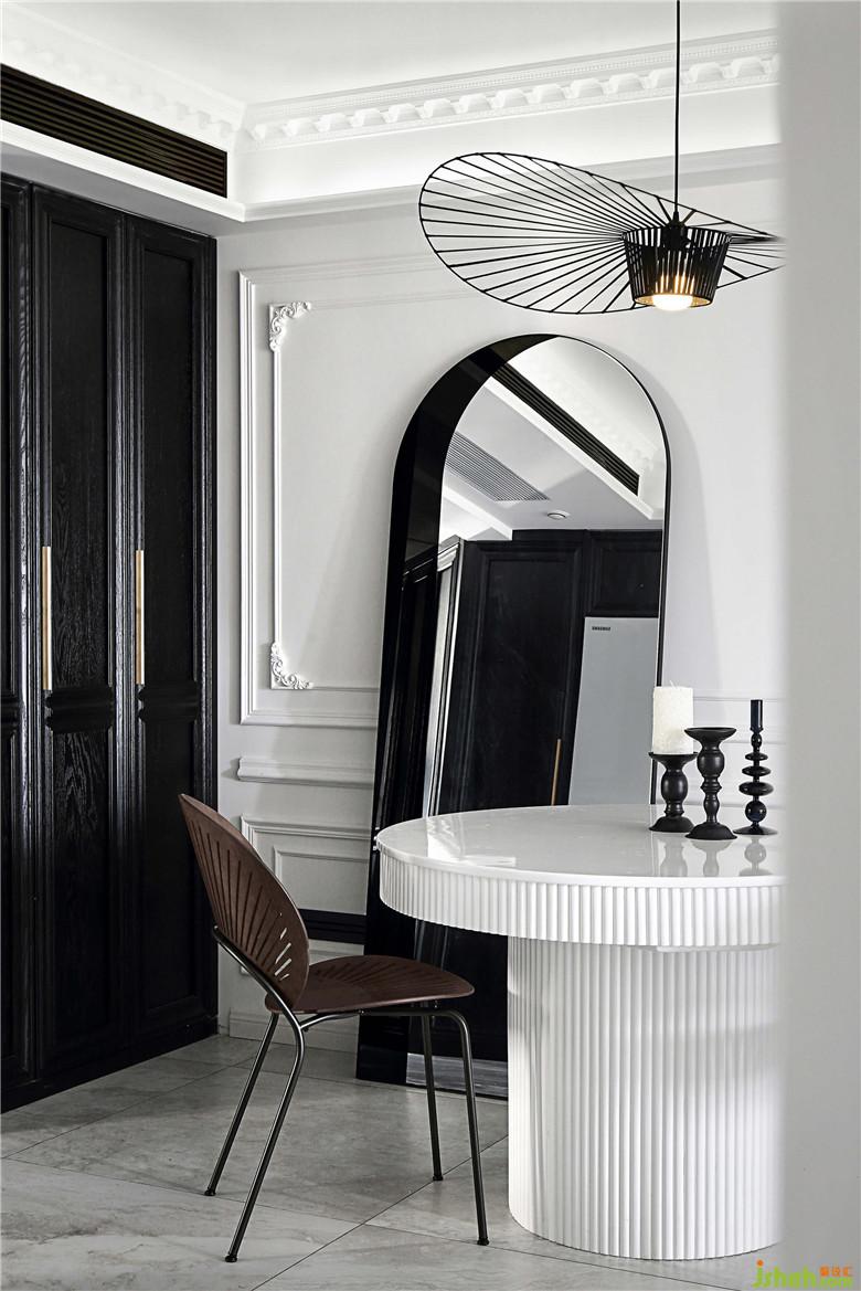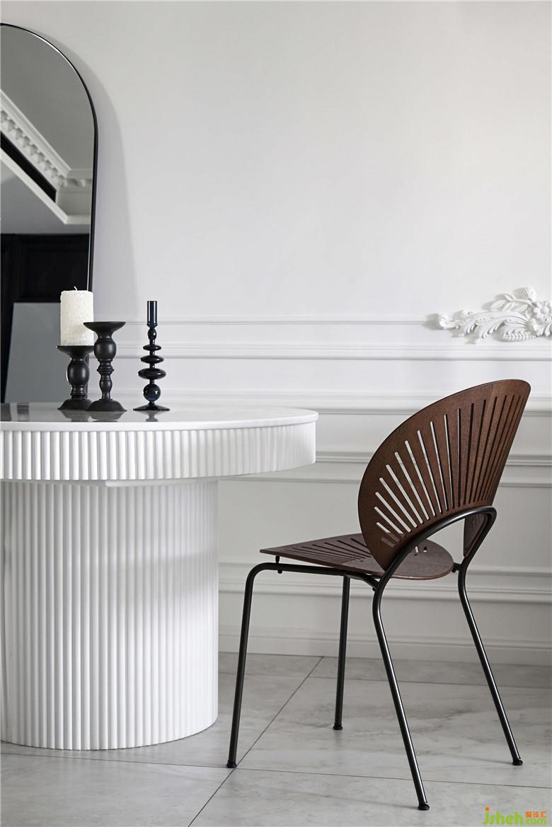 餐厅的墙面一面是黑色柜体的收纳空间,另一面是连着客厅部分的回形线条白墙,黑白的搭配视觉感十分鲜明。靠墙而立的拱门形的镜子,产生奇妙的穿越感,好像可以穿过镜子走到另一面。造型别致的草帽吊灯和孔雀椅虽然颜色上并不亮眼,夜晚开灯的时候会投下好看的光影,室内设计师让餐厅的黑白空间之中线条层次更具节奏,给人一种文艺电影的即视感。