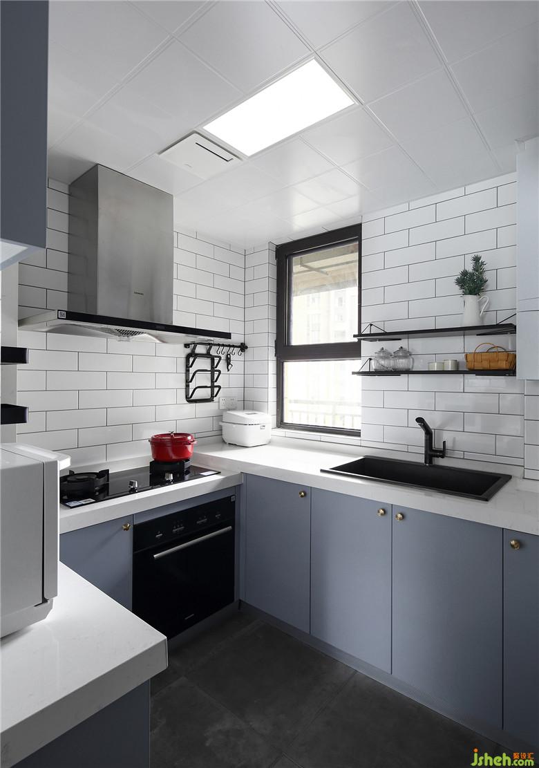 室内设计师改变了厨房门的位置,让客餐厅与厨房连集中在一起,日常生活动线也更方便。蓝与白色将厨房空间点亮,定制的橱柜可以厨房的杂物都藏起来,只留下清爽。
