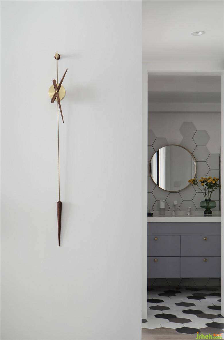 卫生间干区不规则拼贴的六角地砖从地面绵延到墙上,与客厅的极简挂钟相映成趣,家就是从这样的角度可爱起来。