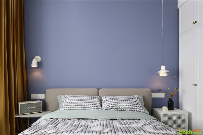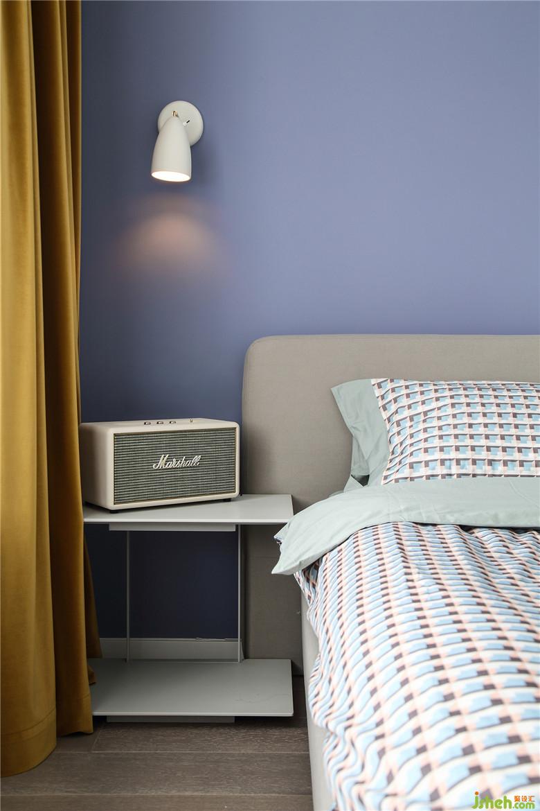 蓝色的墙体揭开主卧的小北欧气质,角落也不缺特别的细节,床头两侧的不对称床头柜和不对称灯饰将趣味渗透进空间,姜黄色的绒面窗帘融化蓝色冷感给主卧添上复古的韵脚。