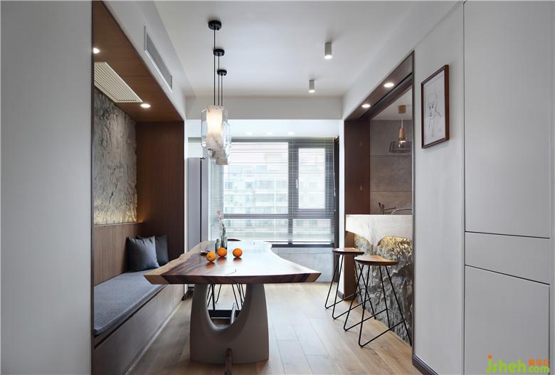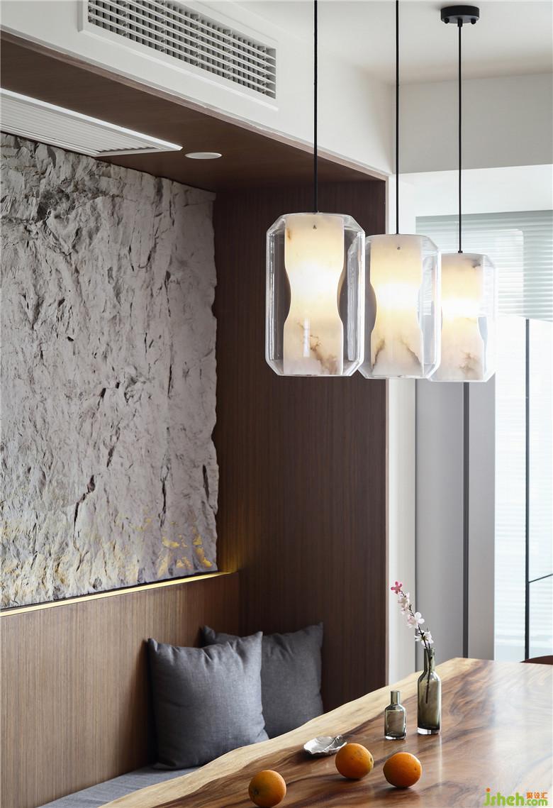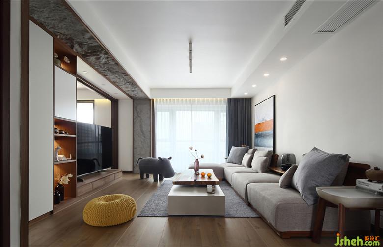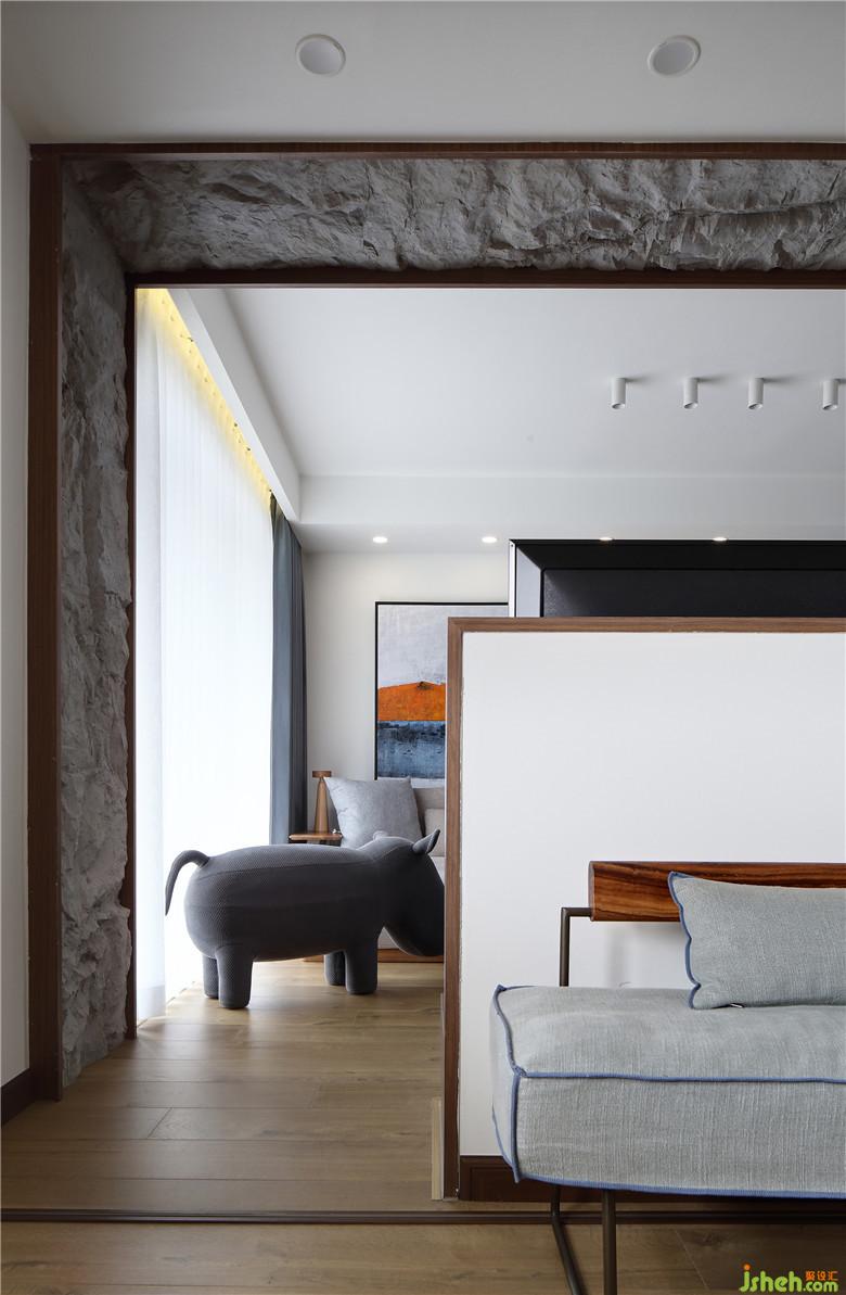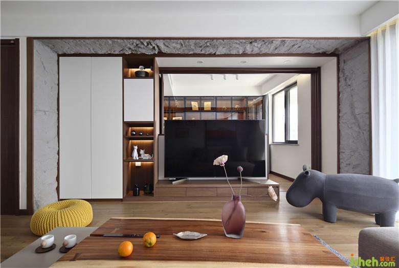 客厅空间渲染出大块大块的白色,是简约、干净的底色。设计师将电视背景墙设计成了有趣的一部分,一半封闭一半通透,视觉上产生了微妙的平衡。既不会有完整一块扑面而来的拥堵感,也不会有将休闲区暴露无遗的尴尬,客厅与休闲区连接着是半遮半露的自由与内敛气息。考虑到也有分隔的需要,设计师选用了折叠门,隐秘和自由都可以拥有,拉上之后可以作为独立客房使用。为了丰富电视背景墙的视觉效果,室内设计师采用了新材料,将玻璃纤维处理成石头的肌理,喷上石粉,嵌入电视背景墙的外框中,与白色的柜体,胡桃木的包边组合,是自然、质朴的风貌。