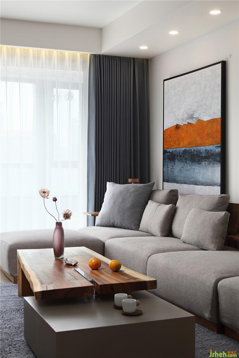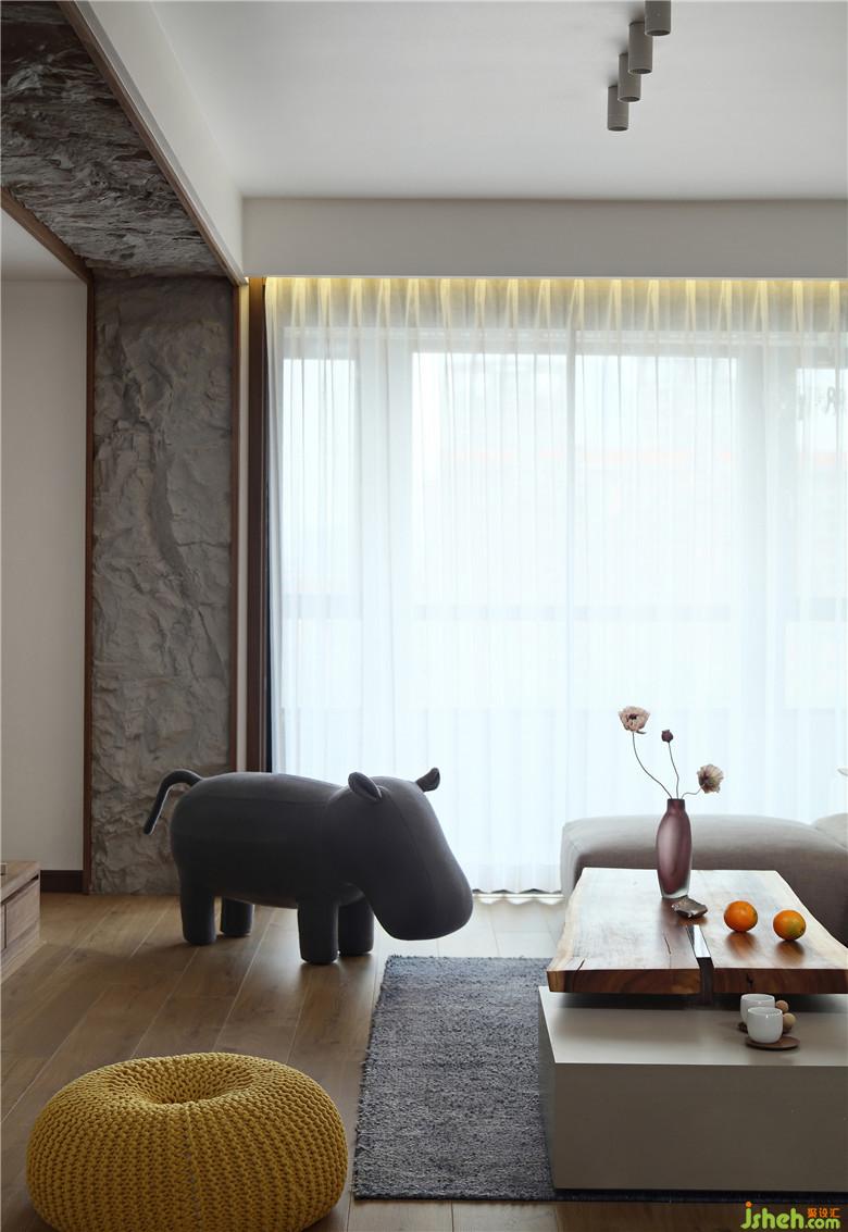 业主偏爱天然材质、素雅的颜色。原木材质没有过多装饰的茶几,是与整体风格契合的,带着些微古意的淡雅,身处其中颇有菊影叠疏篱的意味。色彩强烈的装饰画只摆在沙发一角,河马形态的沙发,凝聚了和煦的温暖氛围。