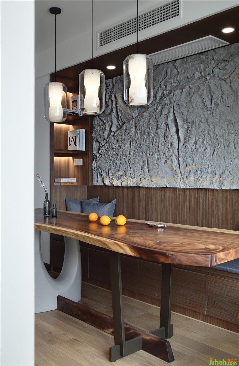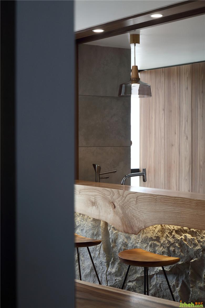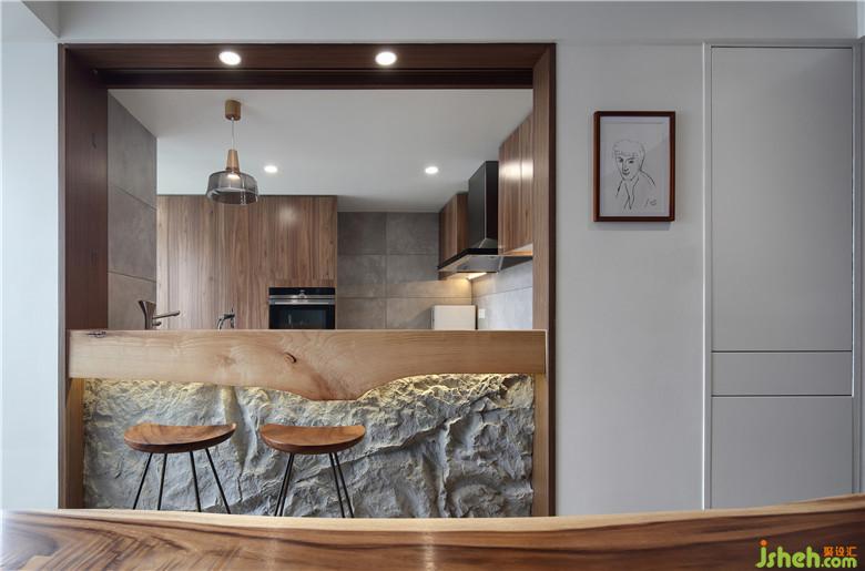 餐厅与厨房相邻的一侧做了半开放式与吧台结合的设计,室内设计师用餐空间得到了提升也丰富了用餐形式。木质的吧台台面下缘并不平整,连接仿真石材的装饰与卡座部分的墙面呼应。