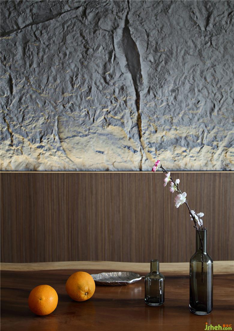餐厅背景墙望去是极朴素的岩石形态,与四周的胡桃木色相配,散发着沉静的气息。设计实现的过程,不同的材料的组合,玻璃纤维塑造岩石的纹理、起伏,石粉覆盖,点缀在屋间便是天然去雕饰的气息。内嵌的灯带光线并不抢眼,是十分和谐的装饰与背景墙融为一体。
