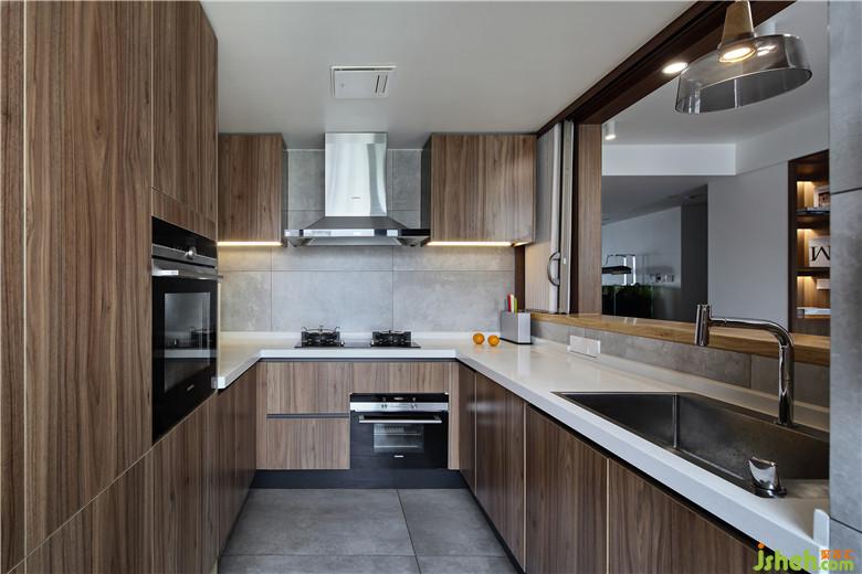 厨房三面皆有橱柜,收纳功能齐全。做烟火气稍多的中餐时厨房和餐厅也有软帘可以开放隔离,生活方式的多种选择,也是这个家的包容所在。