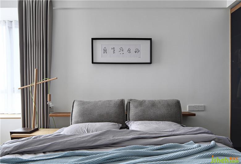 主卧是没有距离感的素色,凝聚了古典的气质但仍然是轻盈的。造型特别的床头柜结合床头吊灯的形式趣味盎然,灰色调的床品为空间注入源源不断的温柔气质,业主自己画的小画挂在床头,这就是有生活气息的家。