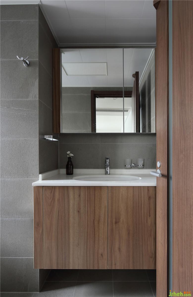 灰色的墙砖与台盆柜的木色相映,卫生间就应该是这样洁净、简约。