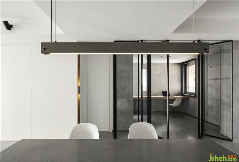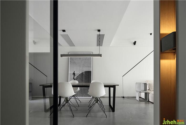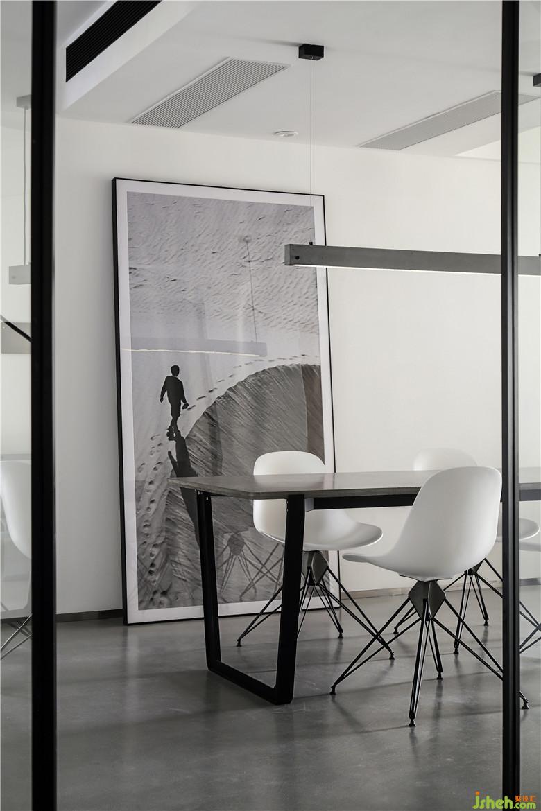 ▲光面水泥桌面被哑光铁架支撑是不带烟火气的餐桌,伊姆斯餐椅凝固出现代都市感,椅腿的设计感给简约的餐厅带来线条的美感,是粗犷意味的细致与气质的混搭。业主自己拍摄的大幅照片,倚在白墙上,是十分具有个人气质的装饰物。