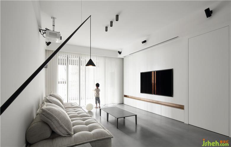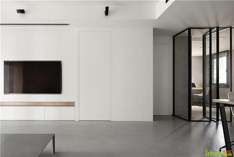 ▲电视背景墙与收纳柜结合,皆采用白色混油木面装饰,下部原木色的抽槽打破整面白色的空洞,带来暖色调的温润。主卧的门藏在电视背景墙的一侧,室内设计师选用同色系的隐形门,美观之下又和谐的隠于整个空间的极简风格中。