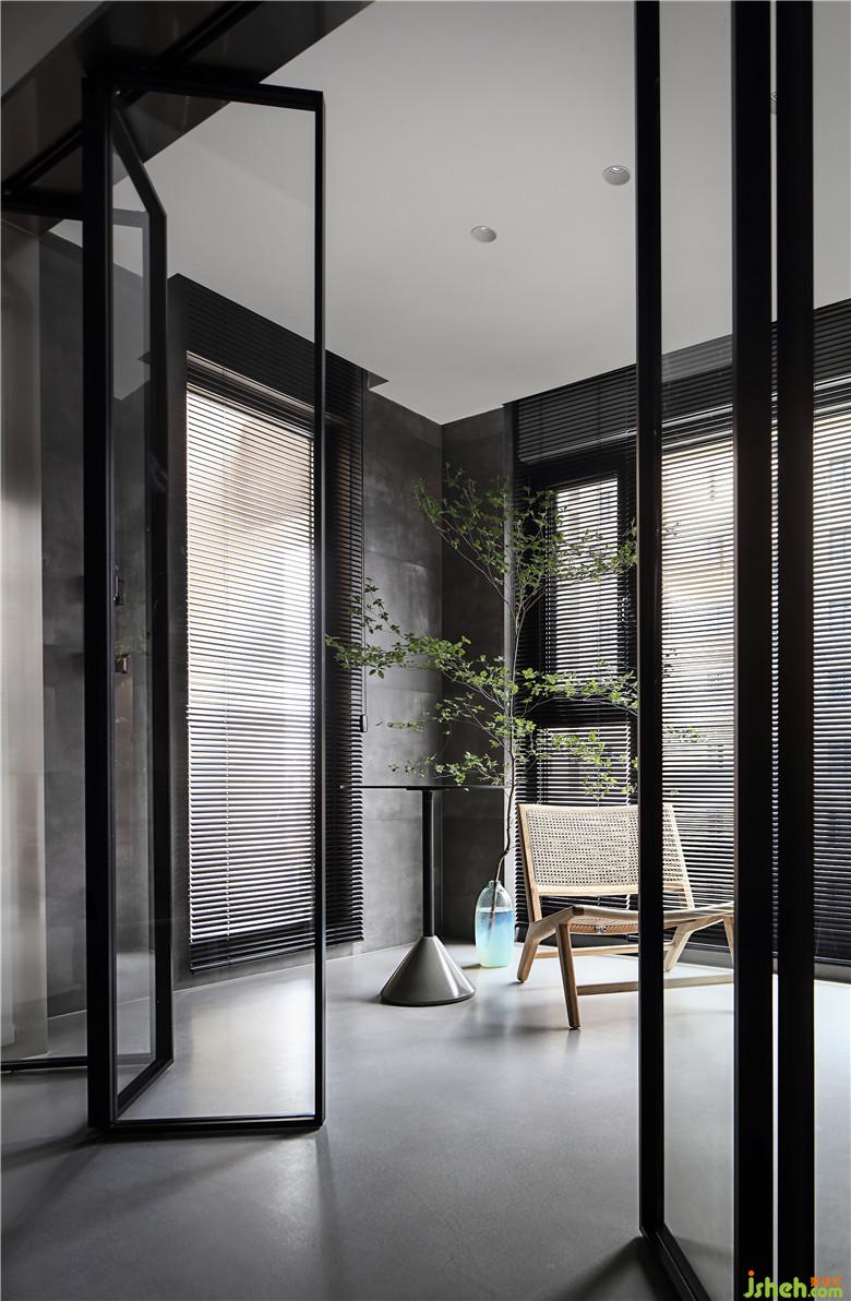 ▲阳台的空间很宽敞,一侧作洗衣功能,另一侧作休闲用。阳台的墙体是稍深的灰色,窗帘用阳光黑色百叶,有层次的深色组合之下并没有让空间黯淡,只显出深层次的质感。