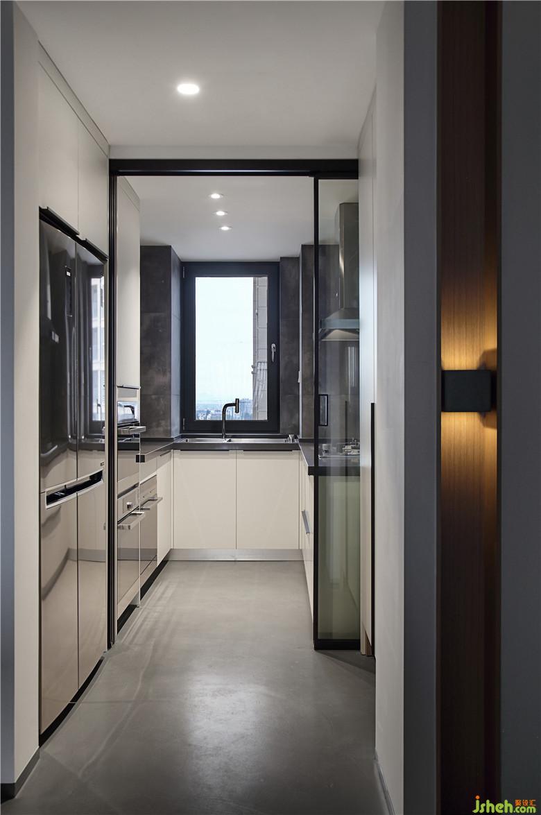 ▲厨房的玻璃移门前后,有柜体补充收纳,并且将冰箱,蒸、烤箱等厨房家电嵌入其中,节省空间,让小空间的整洁观感更加舒适。厨房中白色的橱柜衬托在浅灰的地坪漆与深灰的墙砖之中,颜色上适宜的节奏感可以让小空间摆脱局促感。