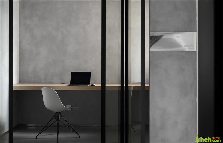 ▲书房墙面刷水泥漆,并没有过多的摆设,是断舍离的极致追求。在玻璃折叠门的掩映下实木一字桌与伊姆斯餐椅相得益彰,是极简与经典设计的组合,门边是刻了业主名字的曲面不锈钢门牌。