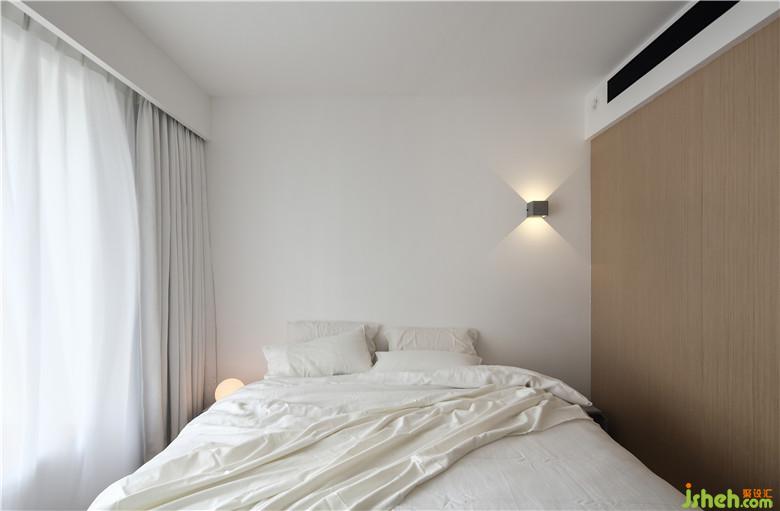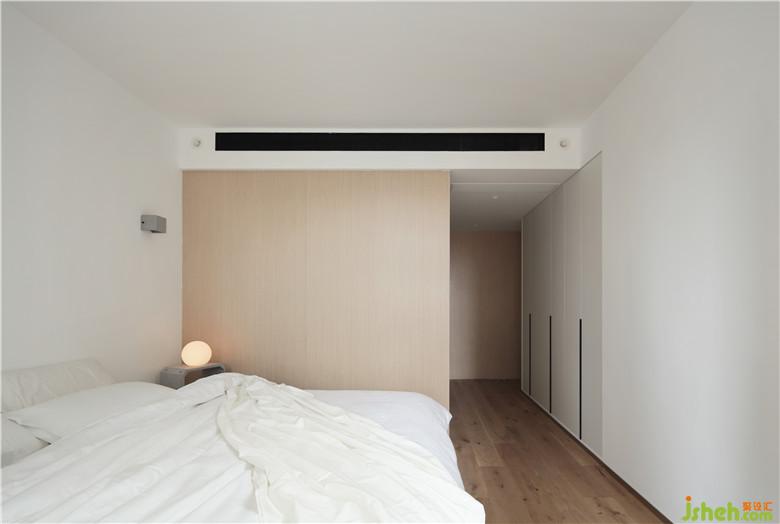 ▲由于墙体的改造与电视背景墙的外移,室内设计师为主卧增添了衣柜收纳空间,从入门开始到床的一侧墙体皆以原木色的木饰面装饰。卧房比起其他空间不变的是依然没有过多的装饰,多的是温润与放松的气息。