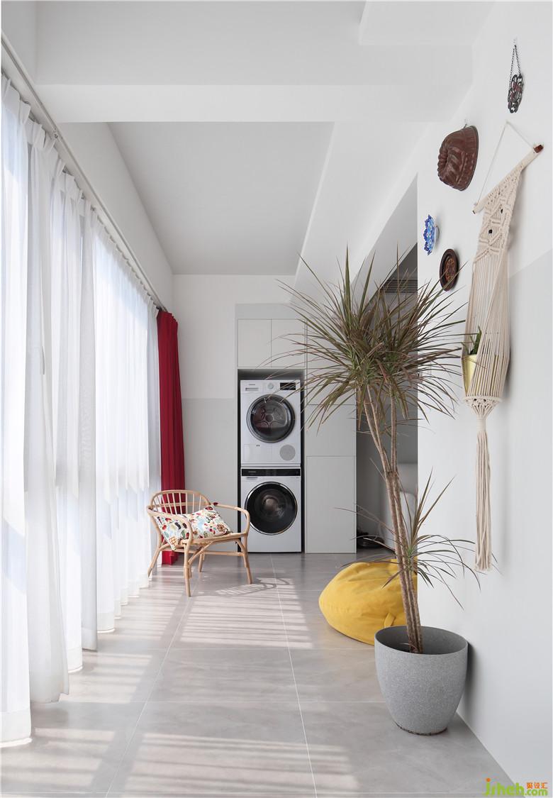 合二为一的阳台让客餐厅空间更多方向的融合在一起,整个空间通透感是来自更多维度的。阳台柜选择定制更适用于自己的生活方式,洗衣机、干衣机的妥善放置与物品收纳都可以得到满足。