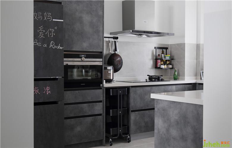 u型的橱柜充分利用了空间,让操作更加方便。仿岩板的柜门与同色的冰箱为厨房增添冷静的质感,像云雾一般的灰色即使在开放式的格局中也把空间区分开来。