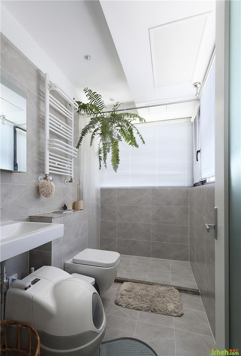 阳台改造的客卫一改原户型客卫采光与通风不佳的问题。悬挂的蕨类植物、白色的百叶窗带来的是自然与明亮,即使卫生间也可以让人从感受上就得到很大的变化。