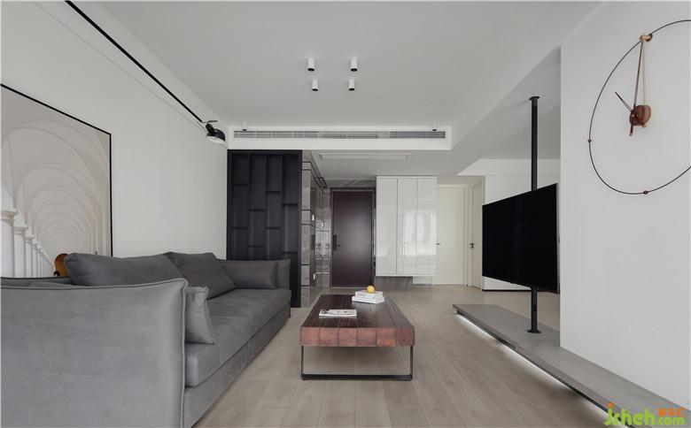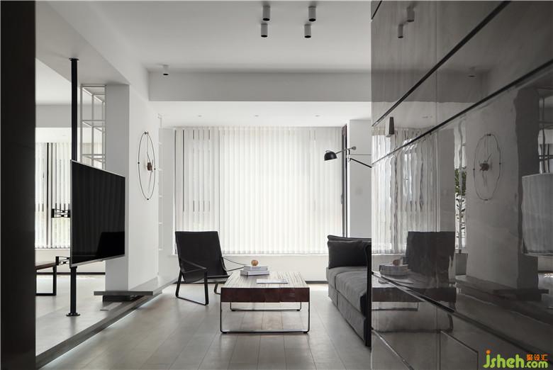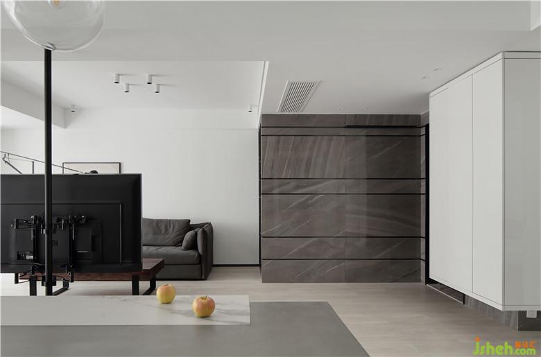 ▲入户处的白色亮面烤漆柜体选择了通顶不落地的形式,下方可以收纳鞋物,方便进出门。沙发一侧沿凸出的墙体打一组开放式收纳柜,哑光的黑色,让视觉效果更丰富,也补充了收纳功能。