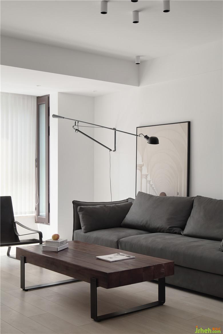 ▲简单的光源布置,有主次、远近,足以在夜晚满足照明需求与烘托气氛。深灰的绒面沙发搭配皮质、纤薄的靠椅,与深色的茶几的搭配是浅色空间中深邃的沉淀。