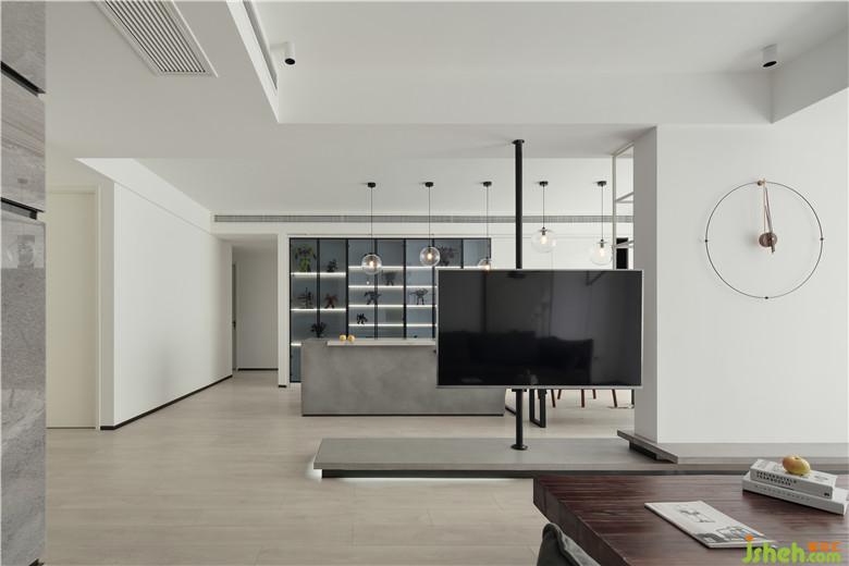 ▲半开放的电视背景墙,以烟火气的生活为背景就是最温馨的日常。摒弃了大部分的墙体,也没有选择功能性的电视柜,而是利用地台的层叠带来造型上的变化,电视固定在定制的柱子上,柱子空心可以将线缆内藏入其中,将通透感归还于整个公共空间。