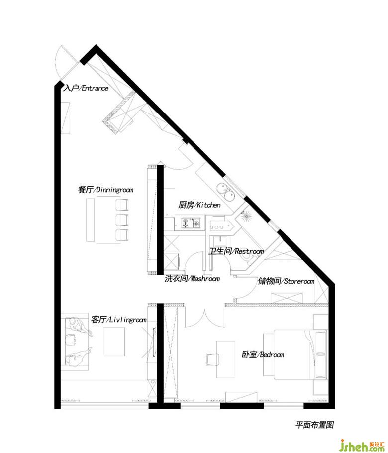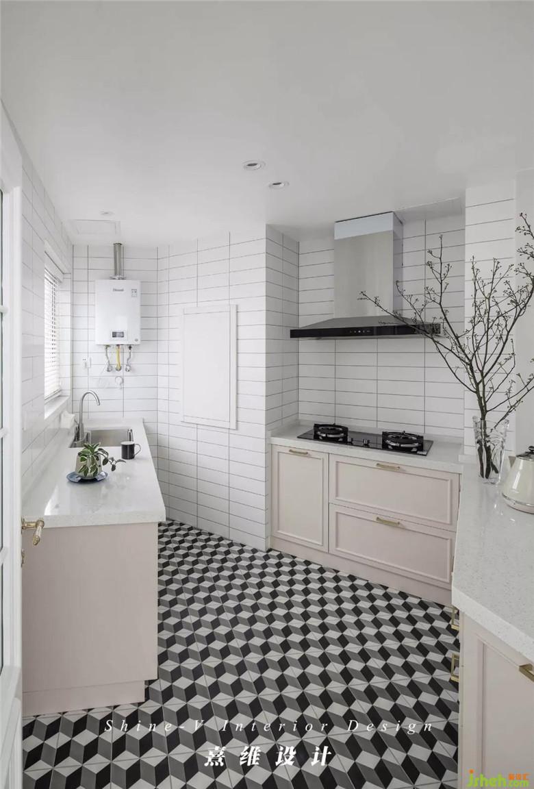 ▲由于原始户型的凹凸与夹角,橱柜沿墙体设立以保证操作空间的最大化。乳白色的柜体与小白砖搭配是和谐温柔却暗含层次,几何花纹的地砖颇具迷幻色彩。