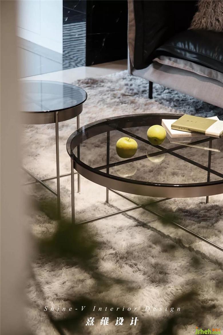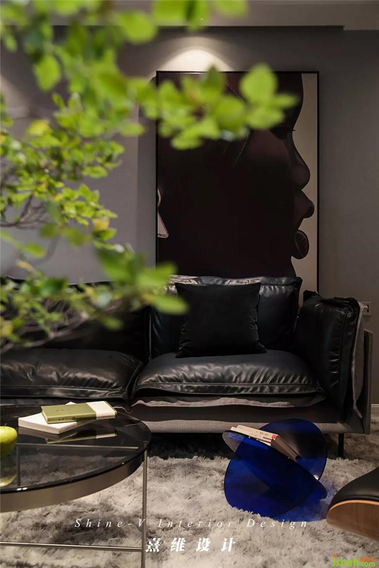 在枝叶绿意之间,茶几的桌面通透圆滑,下面的金属支架伶仃纤细,一大一小一高一低组合在一起,质感与用途都灵活多变。宝蓝色的亚克力杂志架,在黑白灰间,更显绮丽,小小一个却让人眼前一亮。沙发后的装饰画,仿佛从温暖、明亮、深邃的书中走出来,在生活中的某一瞥中消融我们的眼睛。