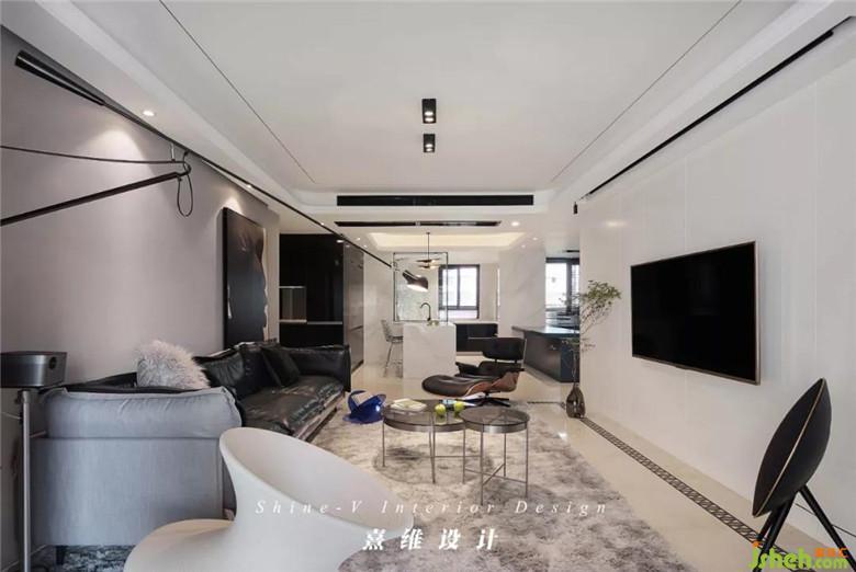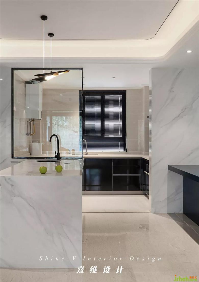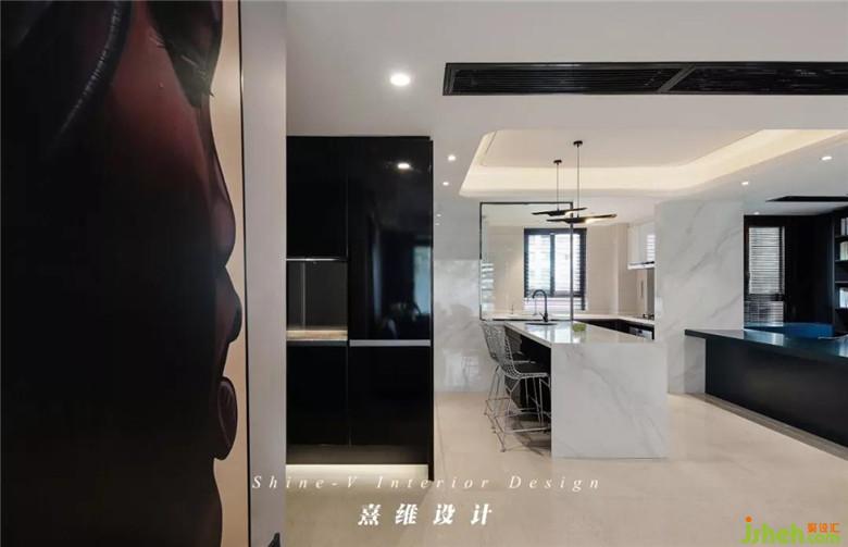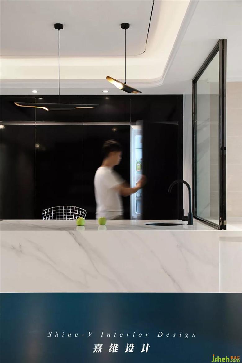拆除原本厨房的移门,岛台连接厨房的地方,增加了半面玻璃隔断,使餐厅空间的视觉效果变得开阔起来。开放式的厨房内部,橱柜配色还是选择以黑白为主,耐看整洁之外也是与内部主要空间的色彩呼应,融洽无边的家可以入心。
