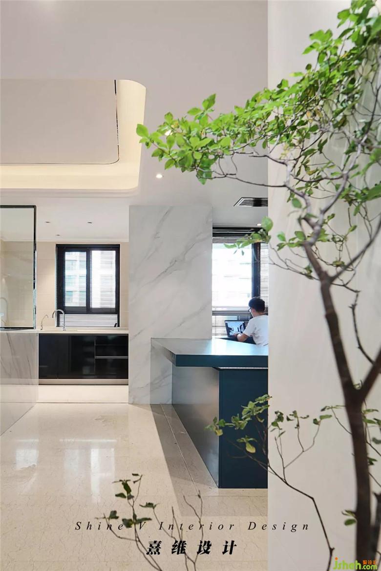 考虑到实际空间的大小,利用与墙面同材的大理石打造可以充当餐桌的多功能岛台。冰箱也被处理成内嵌式,完全隐藏在餐厅边的柜体中。
