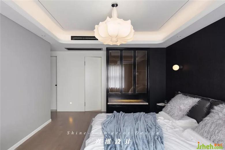 黑白灰间过渡融合的卧室,不是黯淡,而是安静。主卧的卫生间同样更换为隐形门,隐匿在一截白墙上,空空荡荡的留白,却心有回响,伴随休息时松弛的精神。
