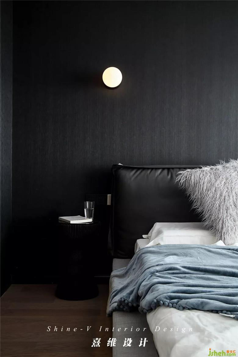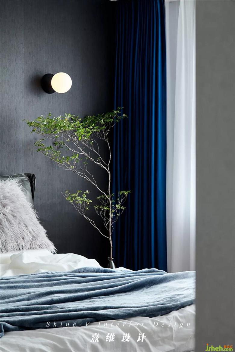 黑色暗纹墙纸铺贴床头的墙面,床头连同插座也是黑色,藏在这些深色中的是紧贴着身骨的让人更容易坠入梦乡的沉静,蓝白交叠的窗帘是夜色与月光,床边的枝叶把心境梳理的平和又有生机。