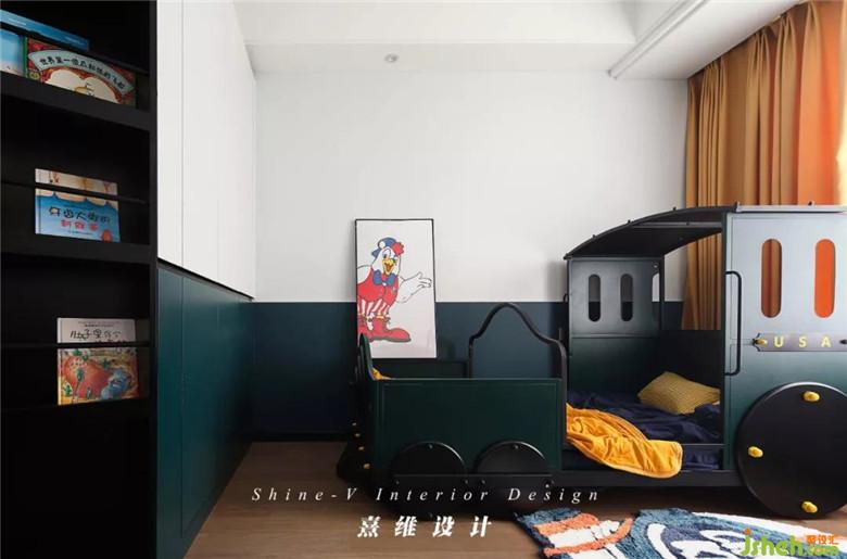 儿童房蓝白分色的墙体与柜体,柜体分为展示书架与衣柜,书籍可以正面存放进去,更直观的方便小朋友寻找自己喜欢的绘本。小火车形状的床大概可以圆小朋友的一个开火车的梦吧。