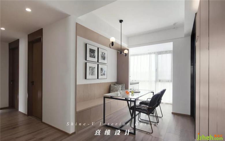 ▲原户型过狭窄的餐厅,为了进入厨房的动线通畅,餐桌摆放选择半卡座形式,节省空间也不会牺牲用餐时入座的舒适度。将卡座两侧墙体与小吊顶收口至与卡座齐平,空间更加规整起来。