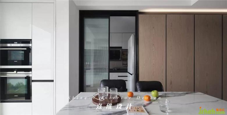 ▲餐桌另一边打造为餐边柜,合理安放厨房电器的位置,继续完善屋子中的收纳系统。新砌的单墙将冰箱藏在墙角,餐厅与客厅材质上的呼应让整体观感更加贴合,和而不同。