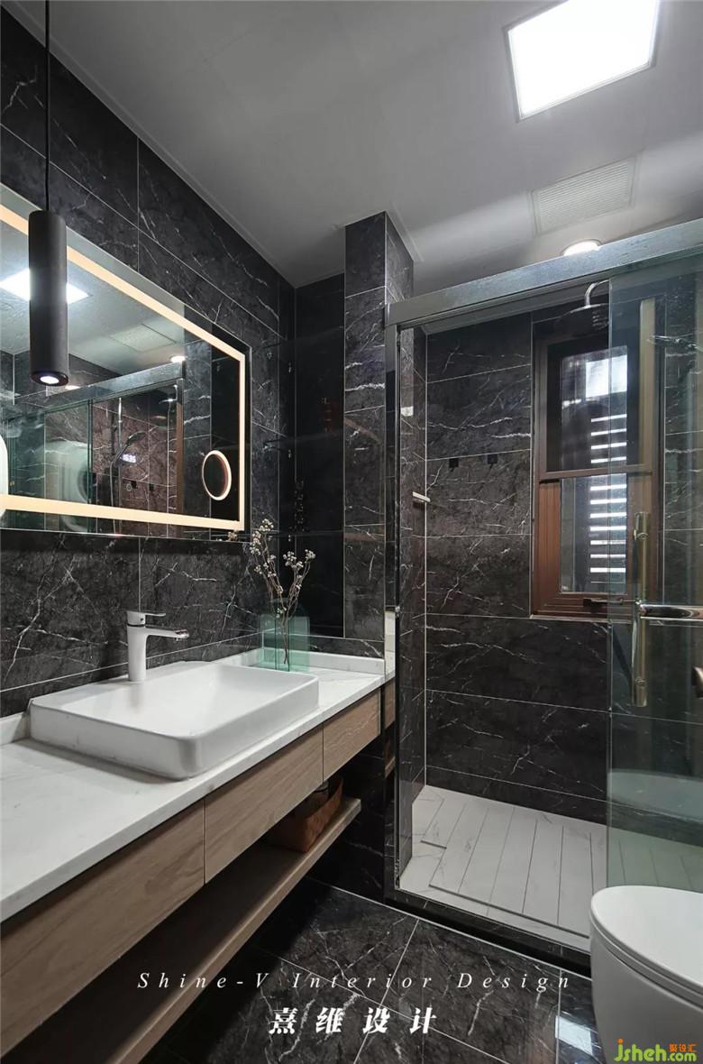 ▲深色瓷砖铺贴的客卫,营造出一种私密的氛围。造型简洁,颜色清淡的浴室柜与壁龛涵盖了卫生间所需要的所以收纳空间。装修公司