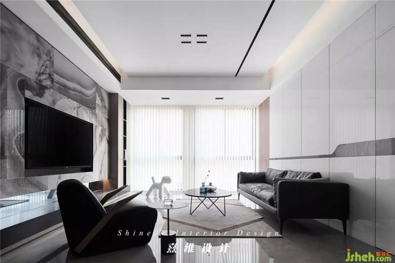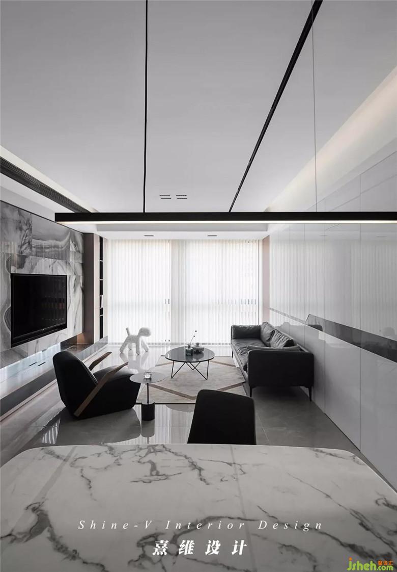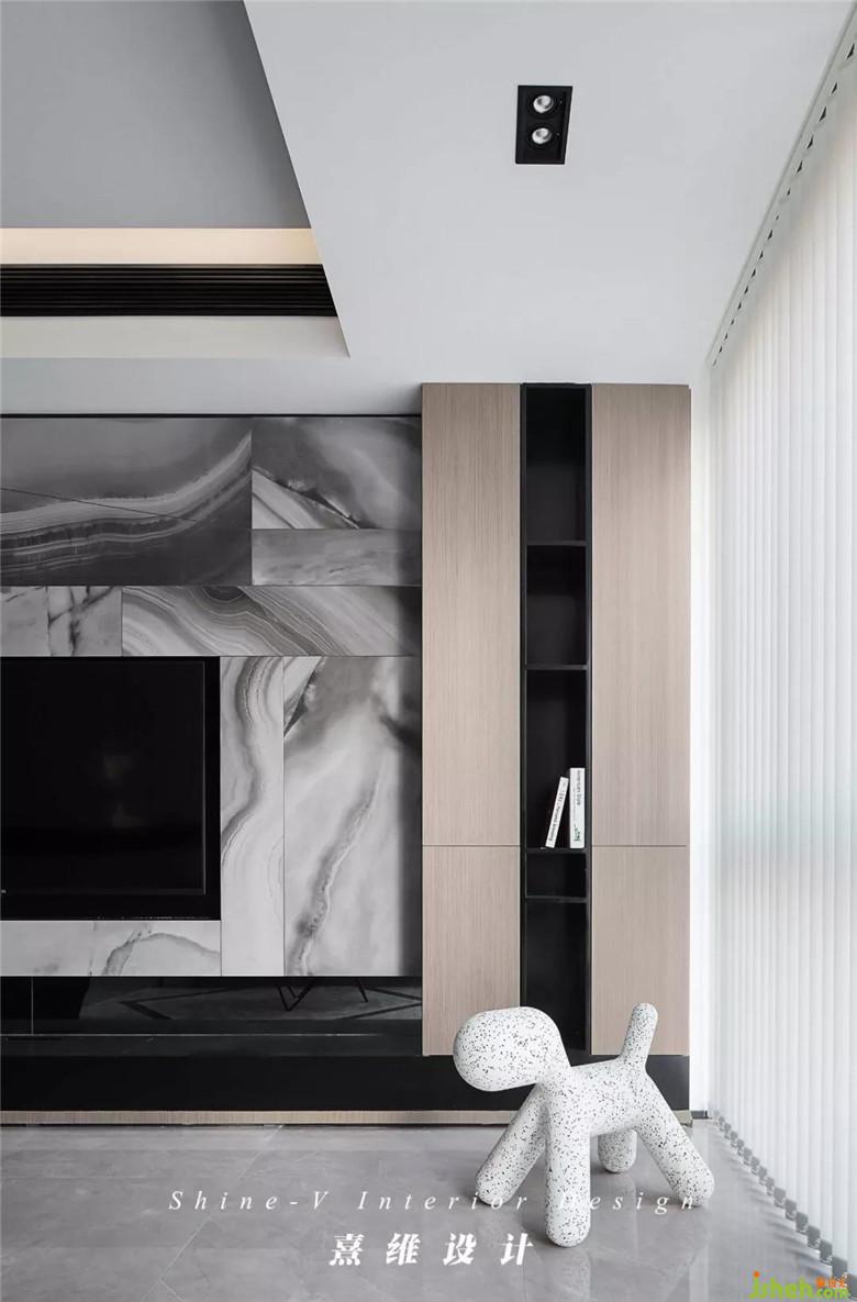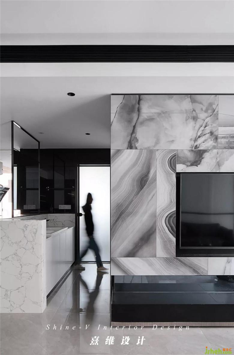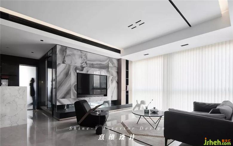 ▲在包容的黑白之下,电视背景墙选择纹理富于变化的大理石以装饰,包覆造型规整的墙面,如宣纸上的墨色,渲染出蜿蜒地貌、皑皑雪原,无迹可寻的变化里,韵味却油然而生。