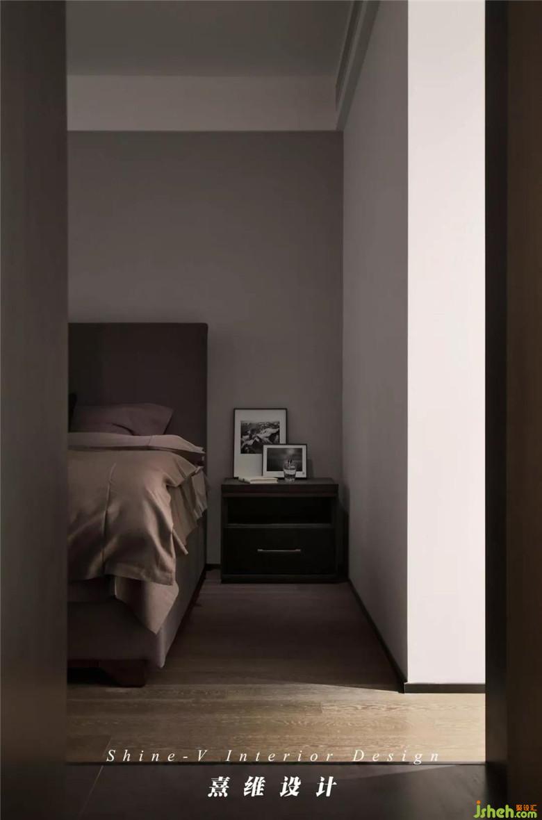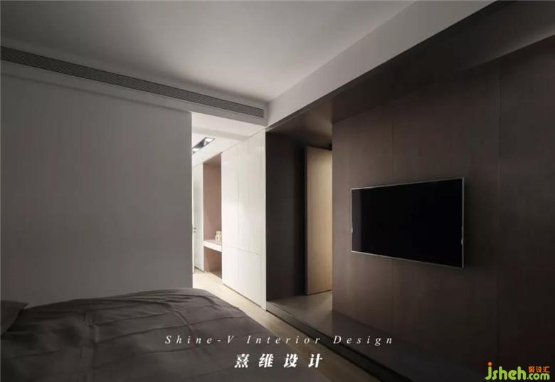 ▲多了一扇门的主卧,去往客厅、阳台不再需要兜一大圈。由客厅中延续而来的胡桃木双饰面铺陈在主卧的电视背景墙上,木色在夜晚更显沉郁,浮躁被摒弃,沉浸在专注平和里,不受外物干扰。