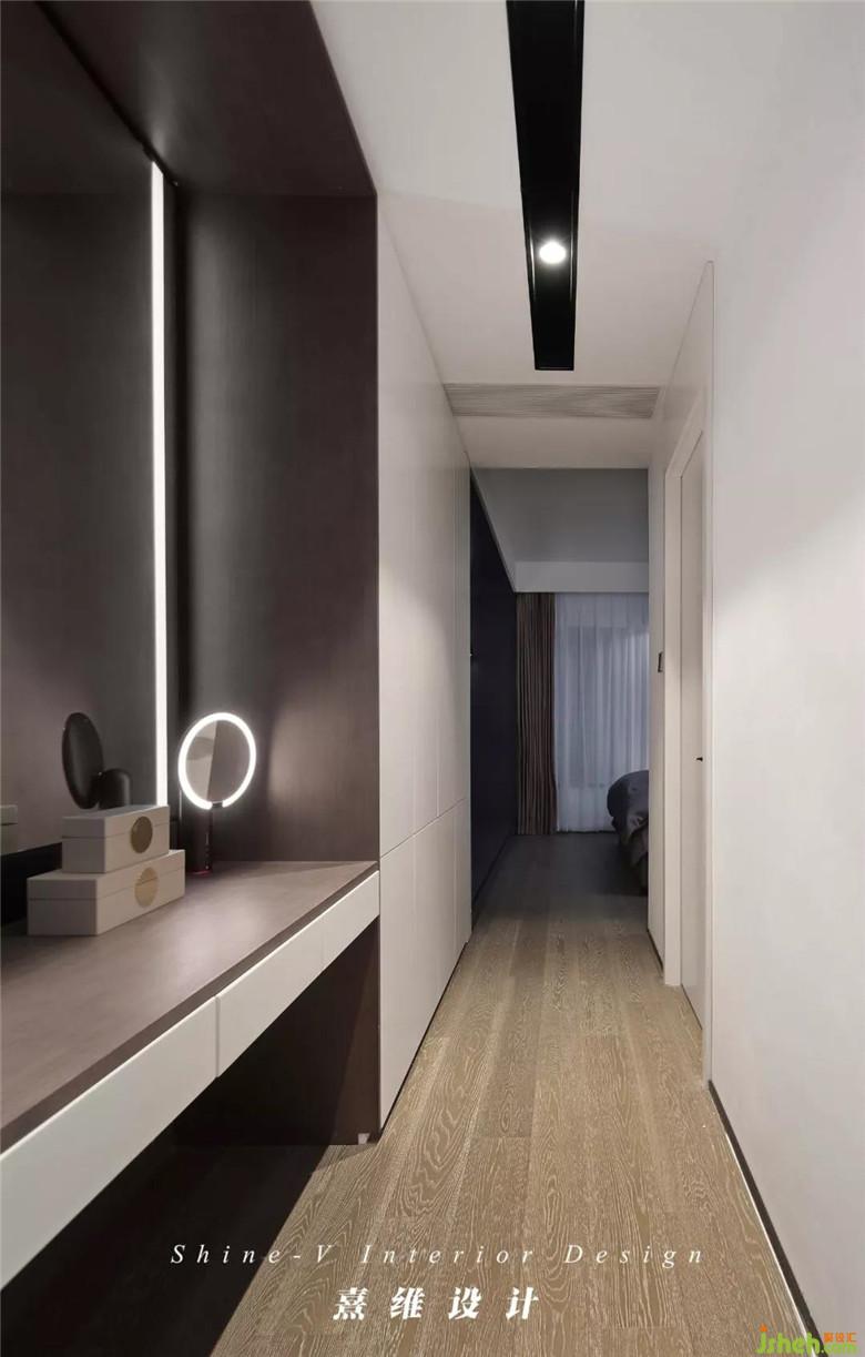 ▲柜子与柜子之间,嵌下一块梳妆台的区域,尽管在并不宽余的走道边,但由于电视背景墙处的另外一扇门,走道被临时占用也不会造成不便,椅子不用时可以收在梳妆台之下,维持日常动线的通畅。