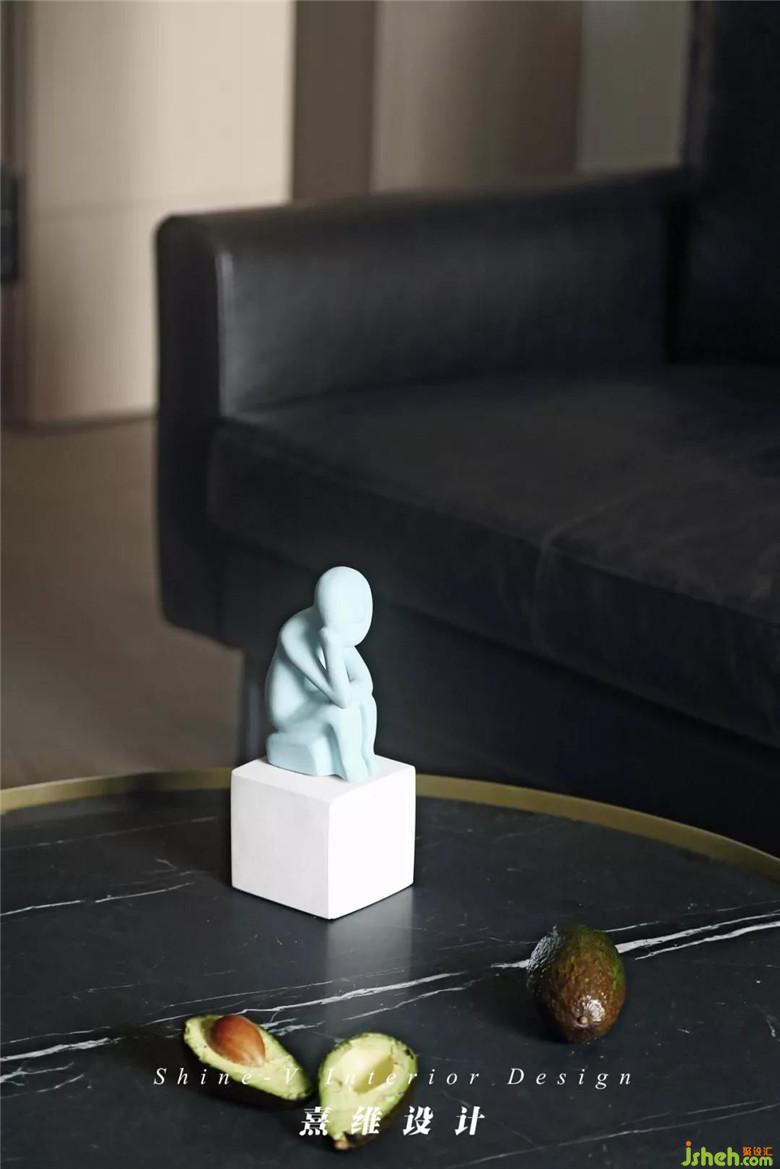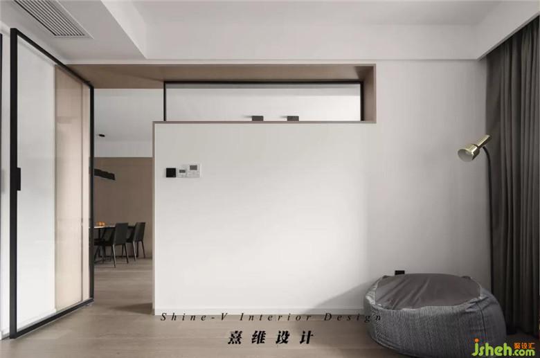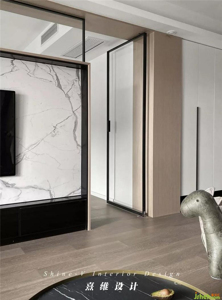 ▲哑光黑框玻璃门,造型极简,墙体部分镂空以玻璃隔断,解决闭塞补充光线,视觉效果回归干净、利落。