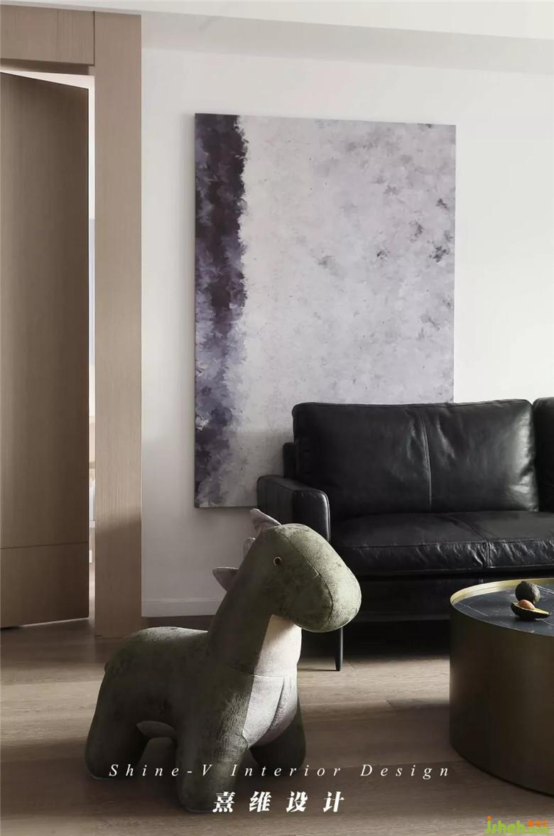 ▲避免客卫门和入户门相对,将客卫门左移。从客卫边开始,木饰面穿过餐桌倚靠的墙面一直延伸至沙发边,自然缝在平面上增加构成感,隐形门维持木饰面的规整。从木色之间突出的黑色展示柜让入户视觉有了中心点,视觉迎来更多角度的完整,别致层次从温馨中显露。