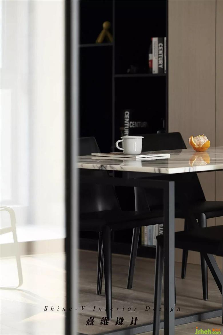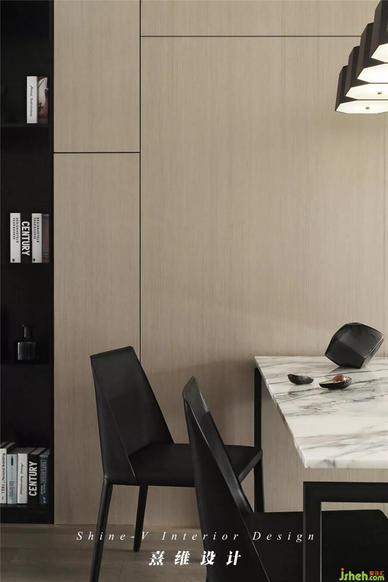 ▲餐椅与桌腿是黑色的明晰线条,餐桌桌面是素白但纹路丰富的石材,吊灯在桌面上方垂下,暖光从黑色环绕的几何块面内散出,如同被轻轻按捺住地喜悦,带着丰厚的温度。