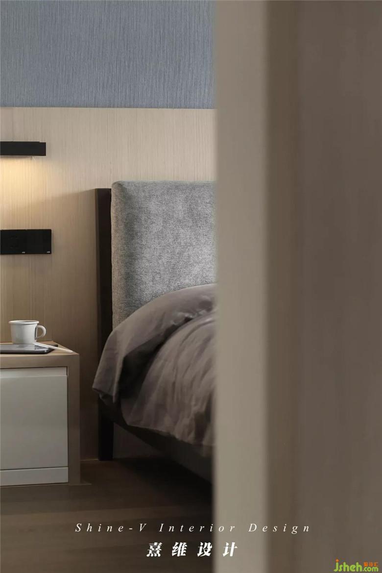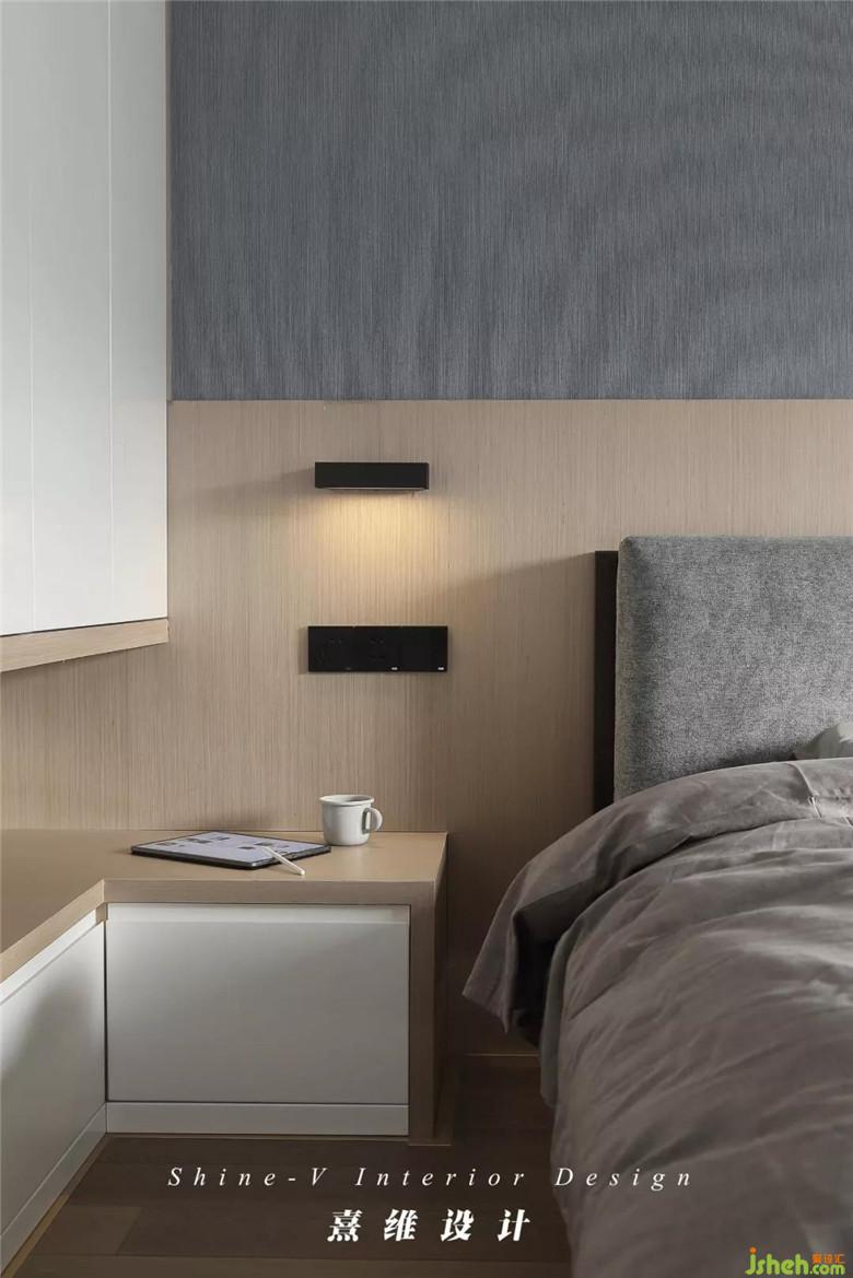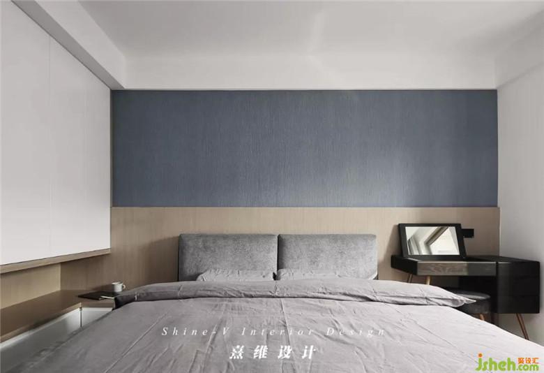 ▲相比其它空间,主卧的样貌倾向于更轻柔自在的意态,依然是原木色,被作为齐腰线的护墙板沿用至主卧床头,木色之上铺贴浅灰蓝墙布,会呼吸的温柔从颜色、质地中舒展出来,是微风携光在床畔停驻,凝成日常不言而喻的惬意。